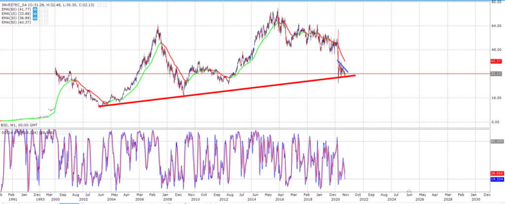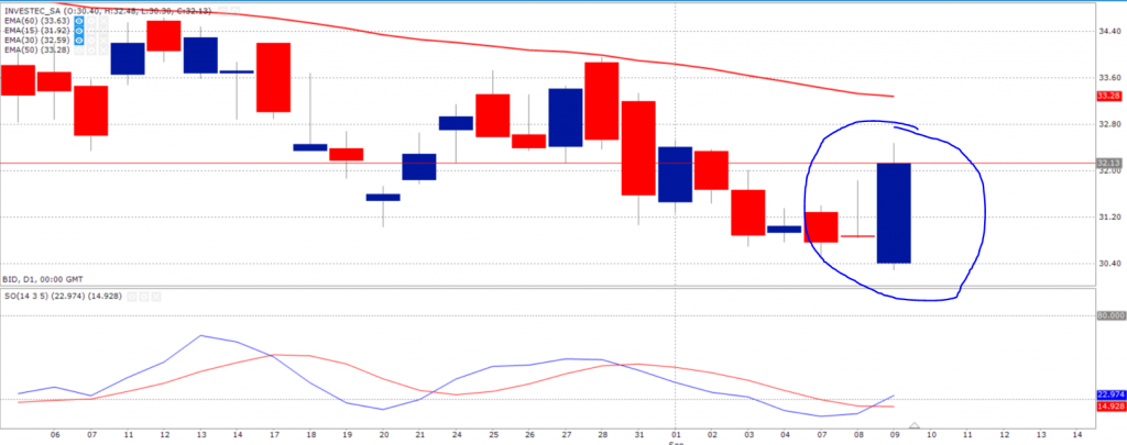 Confirmation: trade above the high of the trigger candle (R32.48)