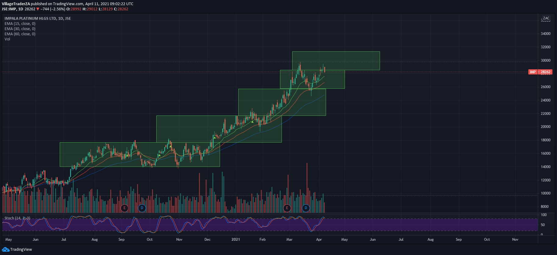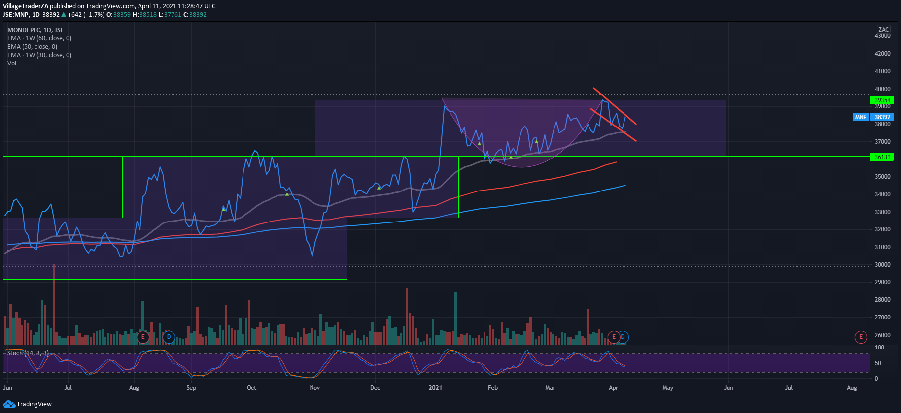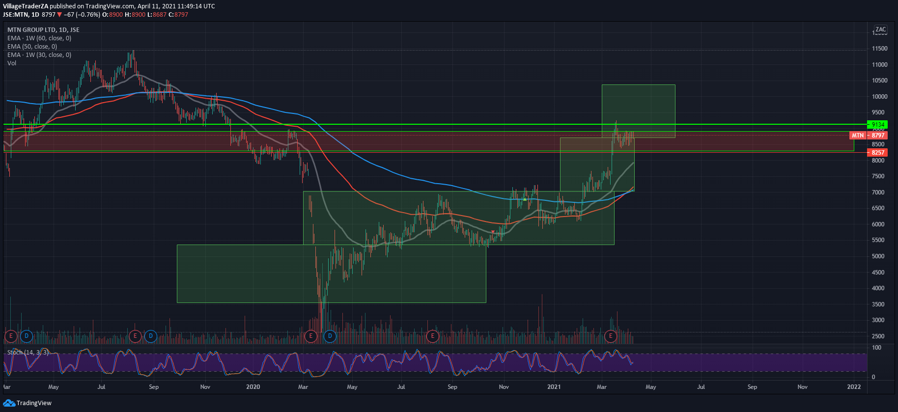MTN has been looking pretty good recently, breaking into higher boxes. The 30w EMA has now crossed the 60w EMA. I’m now looking for a closed above 9130c. I will take a long position on the stock, with a stop loss around 8250c