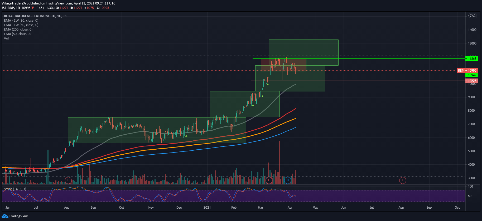 We have a nice horizontal bullish flag on the stock. As the stock looks to break in to a higher box. I’m looking for a break above 11880c. Then I will add to the position and trail my stop loss to around 10420c. To add more wind at the back of this trade. Platinum looks quite bullish as well. There’s a nice symmetrical triangle pattern on platinum. If platinum breaks you would imagine Platinum miners will break as well.