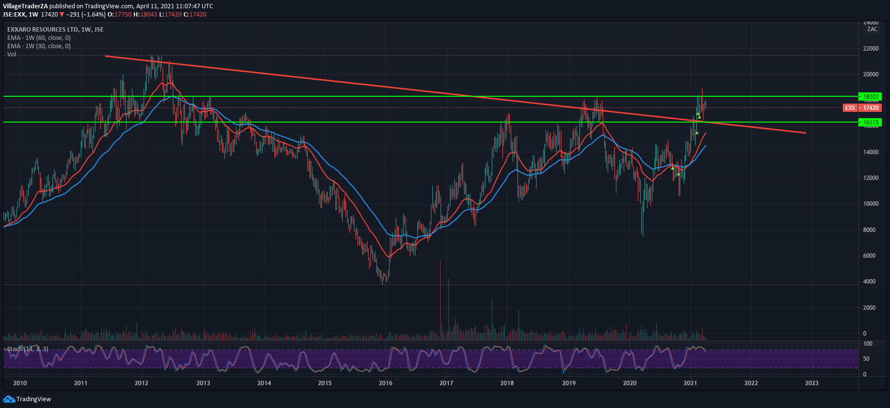 Exxaro broke a significant monthly resistance. We had a nice Doji 3 weeks ago as as the company was paying dividends. I’m looking for a break above 18300c, then I will take a long position with a stop loss below the doji around 16300c.