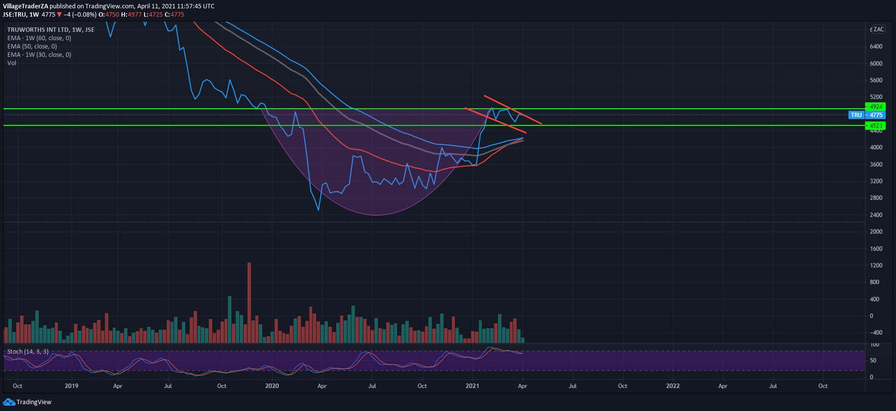 We have a nice Cup & Handle pattern on Truworths. The 30w EMA looking to cross the 60w EMA. Now I’m waiting for a break above 5000c. Then I’ll take a long position on the stock