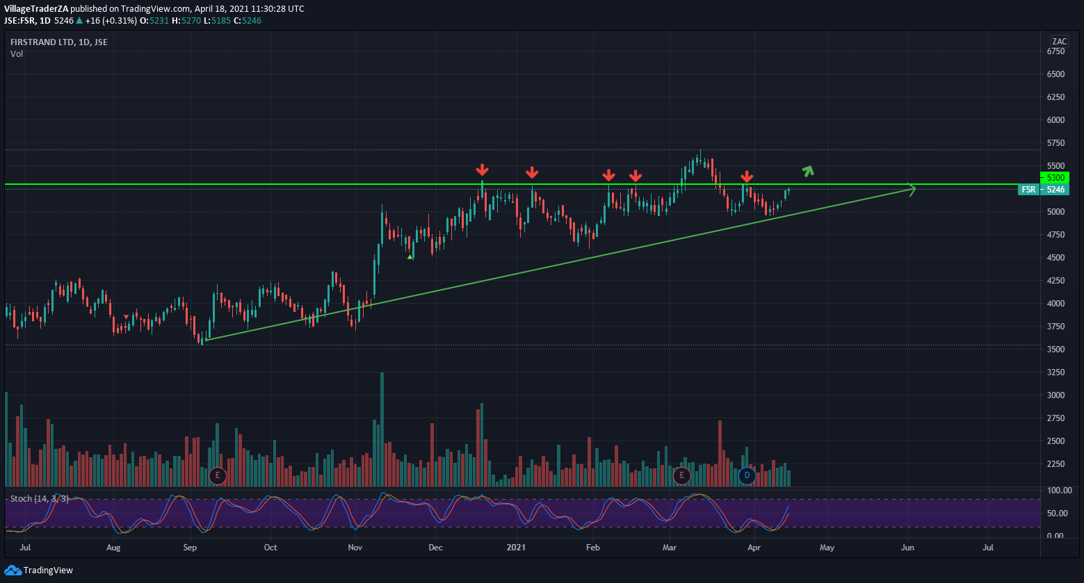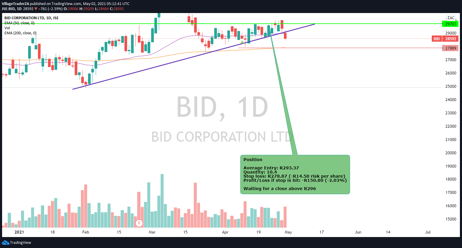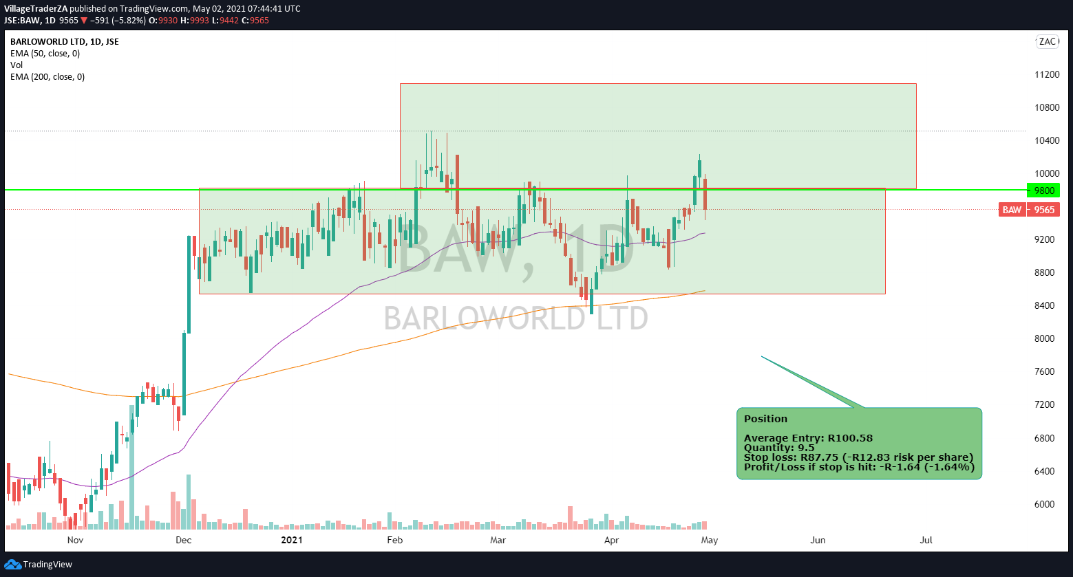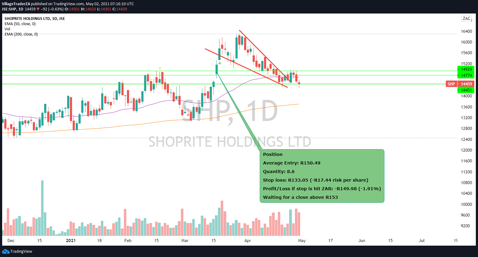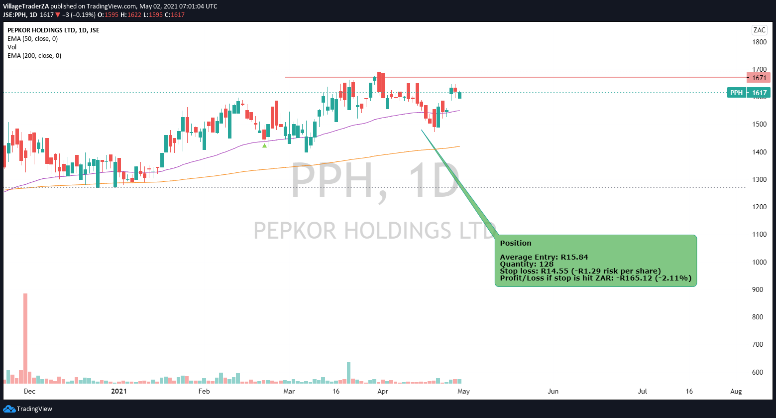 We had a close above R674 in was seems to have been a false break. I’ve added to the position. Now waiting for a close above R680, to move my stop loss. Looks like the stock is having a tough time breaking the R680 resistance