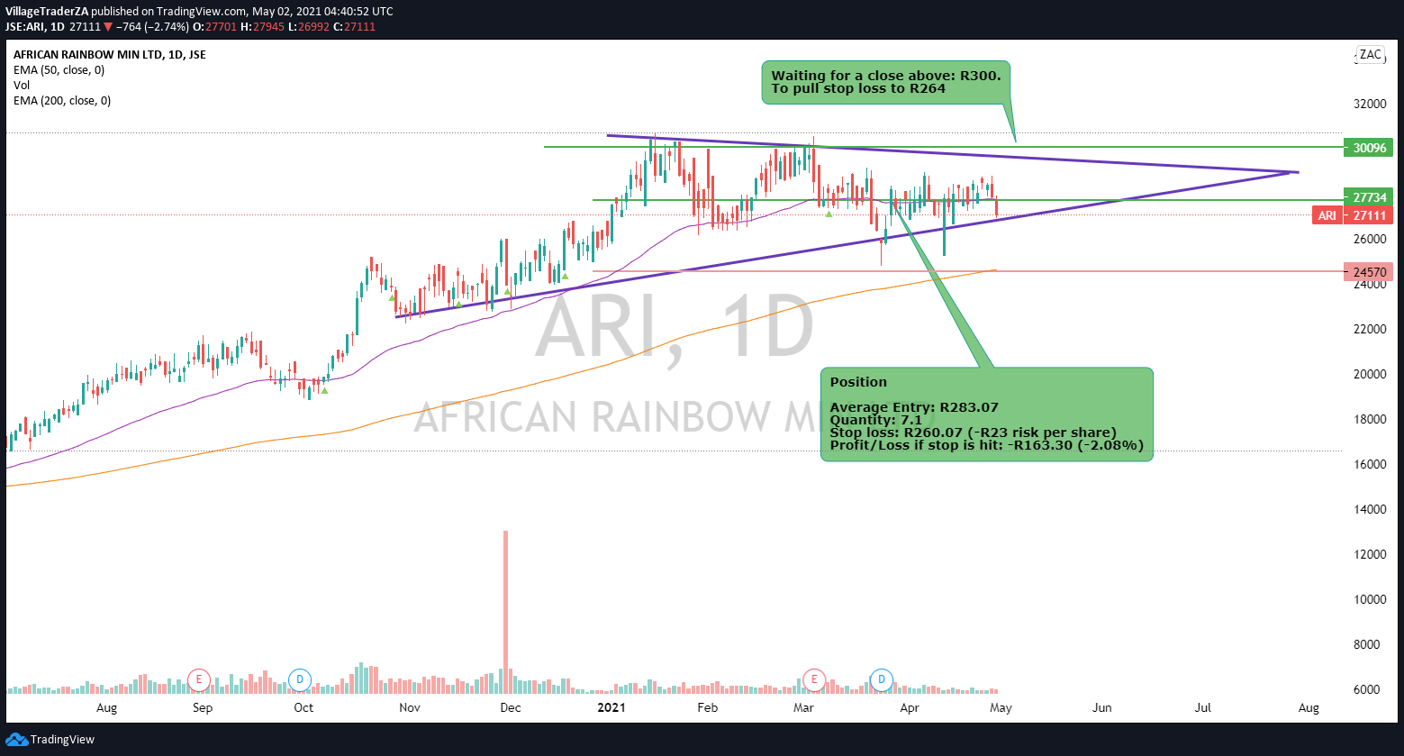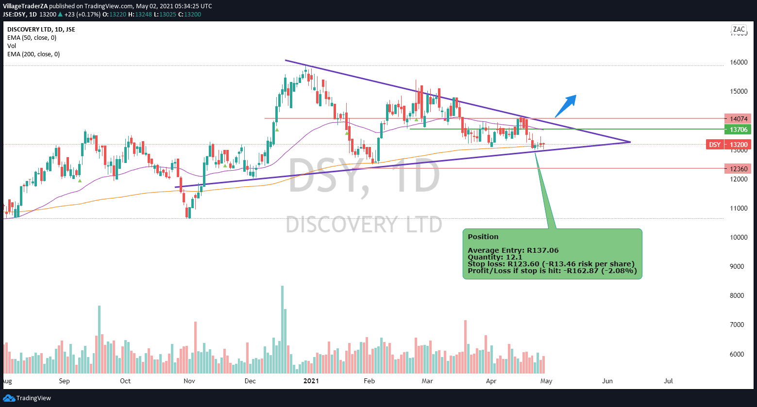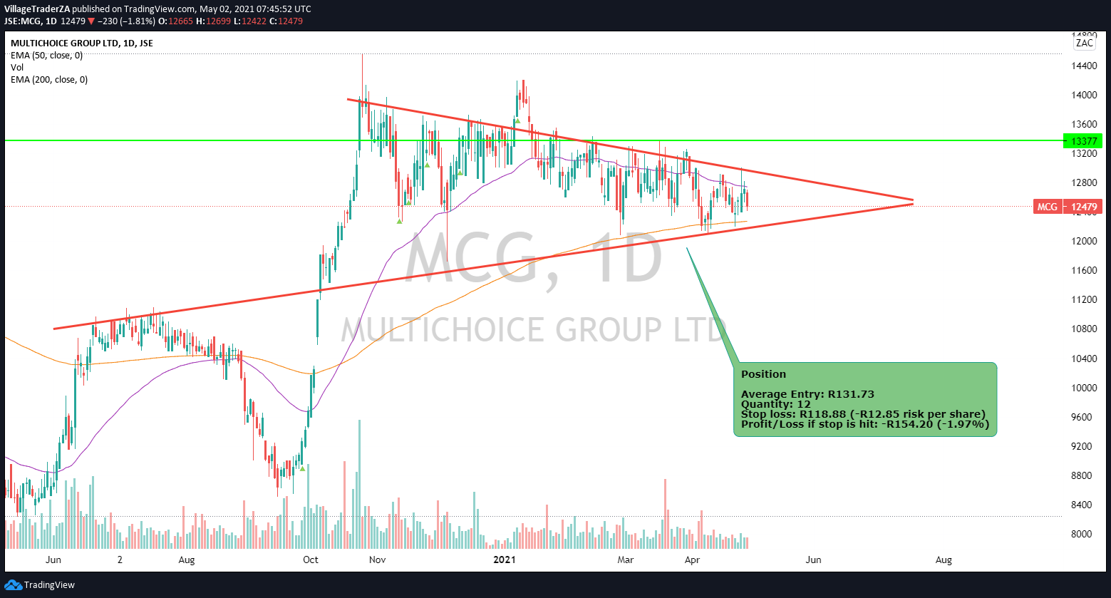 Waiting for a breakout of the symmetrical triangle, and a close above R140, to pull my stop to just below these current lows. Which a higher than previous lows.