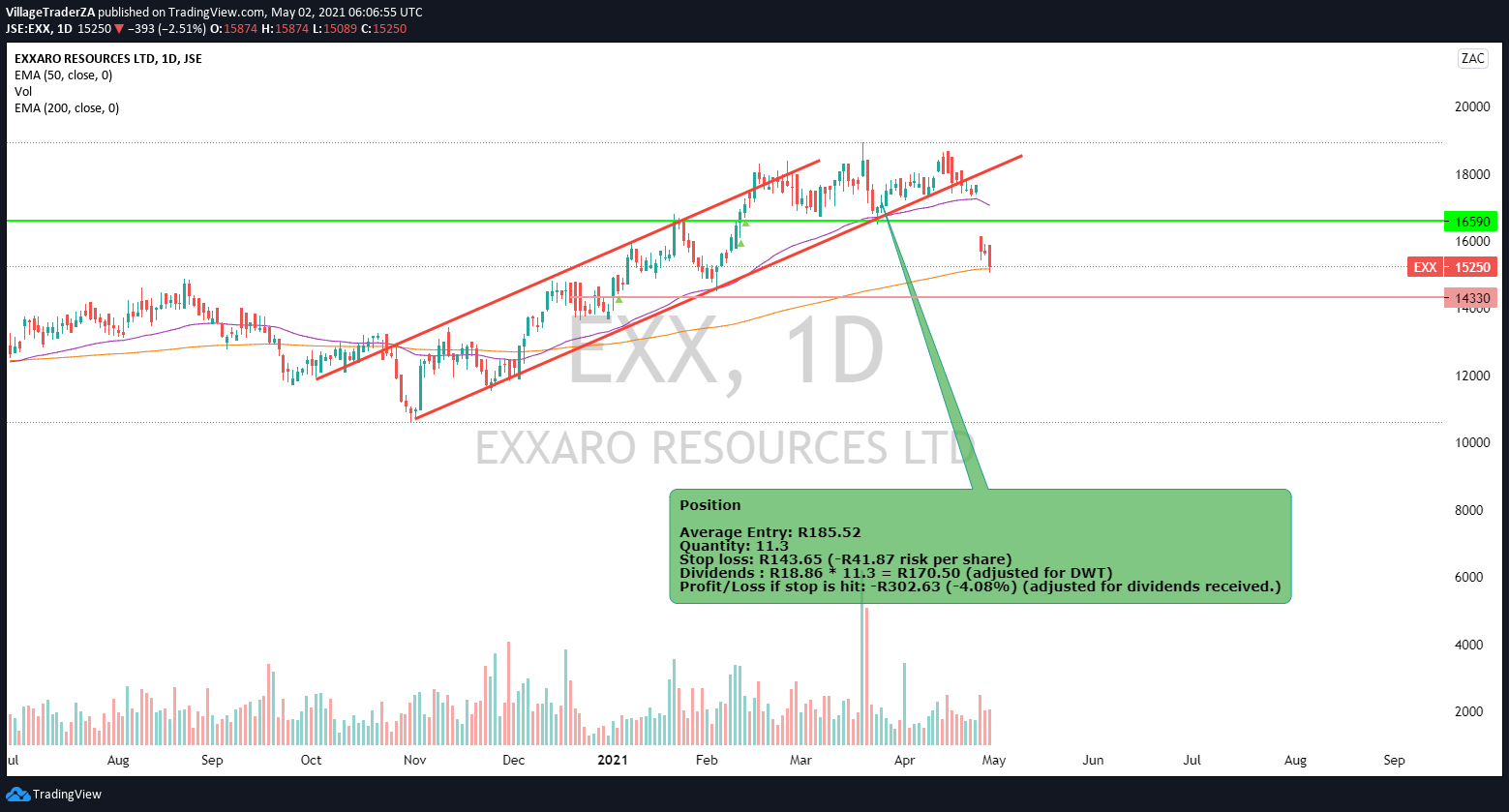 Exxaro gapped sharply on ex div day. The dividend was quite chunky. To account for this I moved my stop lower to R123.60. The stock has held the 200d EMA since.