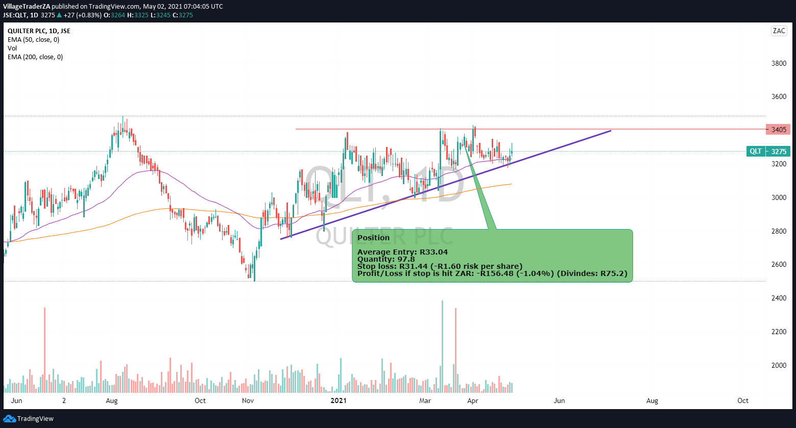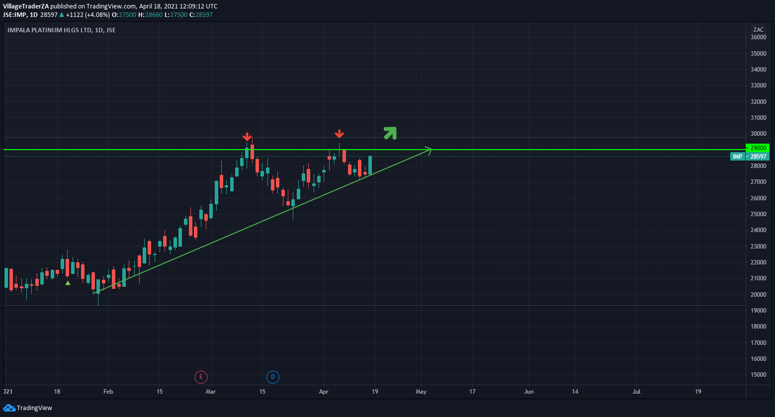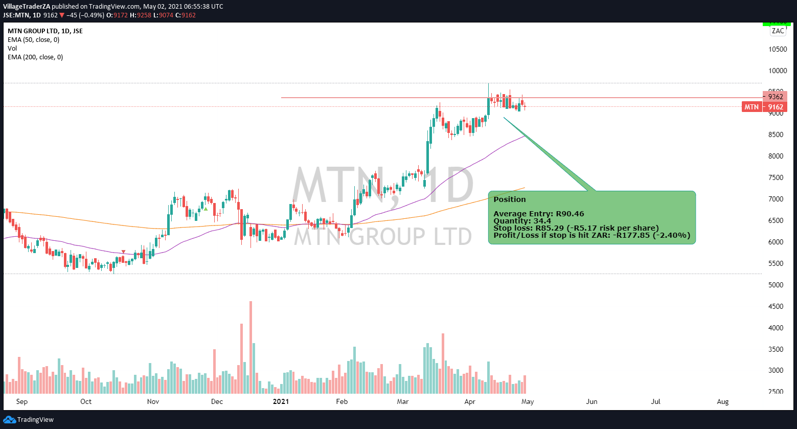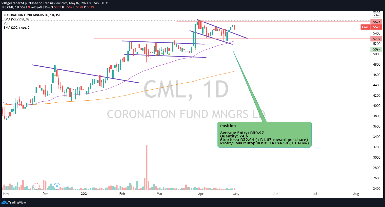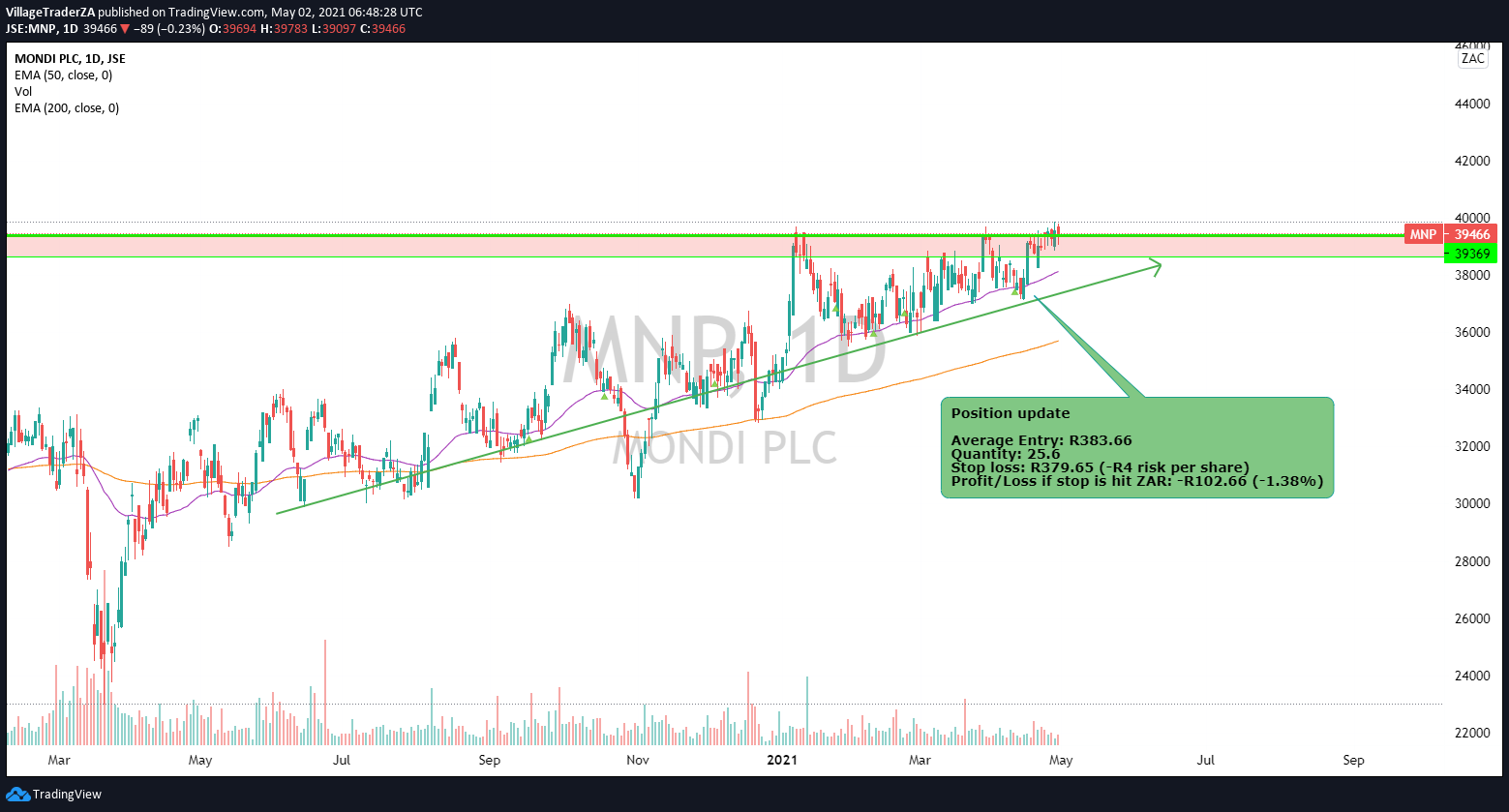 We had a close above R393, I added to the position. I’m now looking for a new high close above R396.80. To move my stop loss to R386.