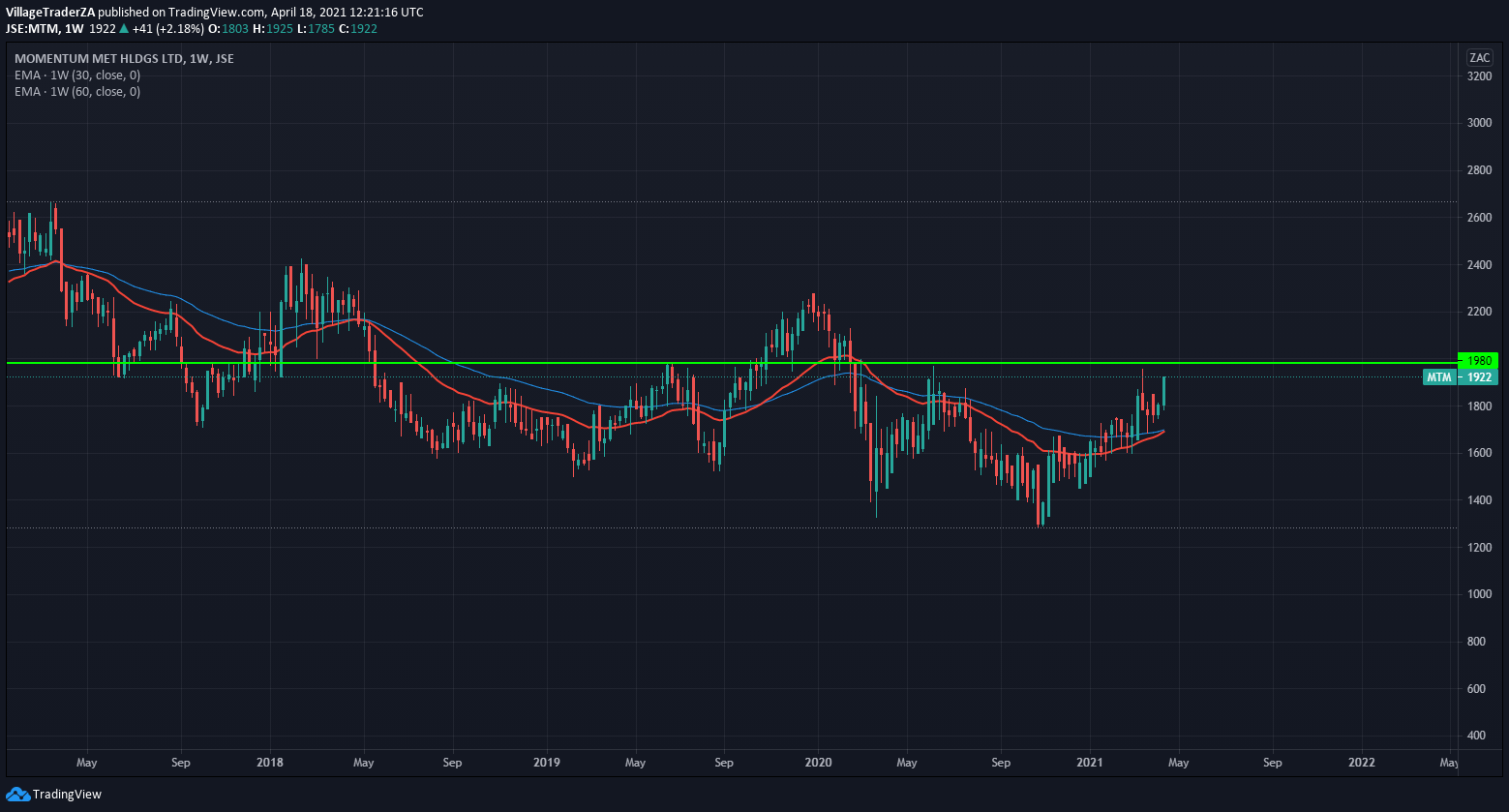 Waiting for a close above R19.80 & 30w EMA (16.93) to cross the 60w EMA(16.99)