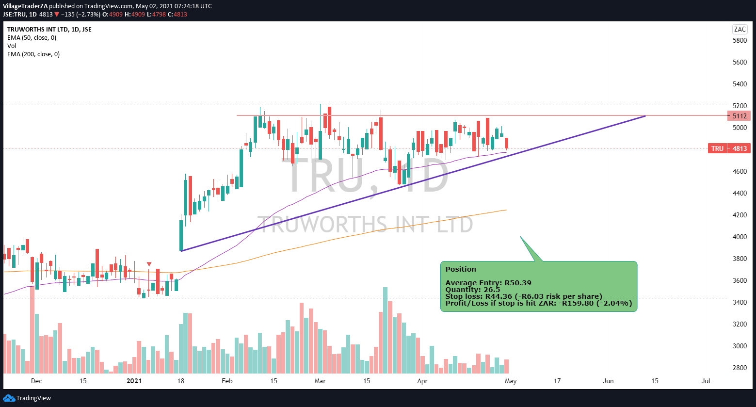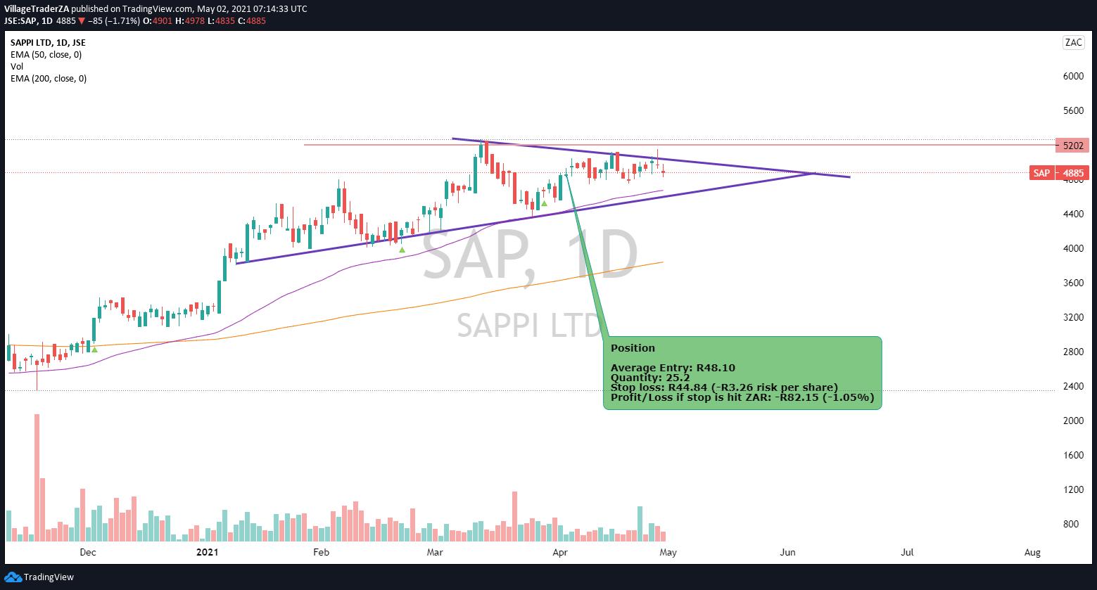 The stock hold the 50d EMA quite strongly. On the break above R51 I will trail my stop to around R46