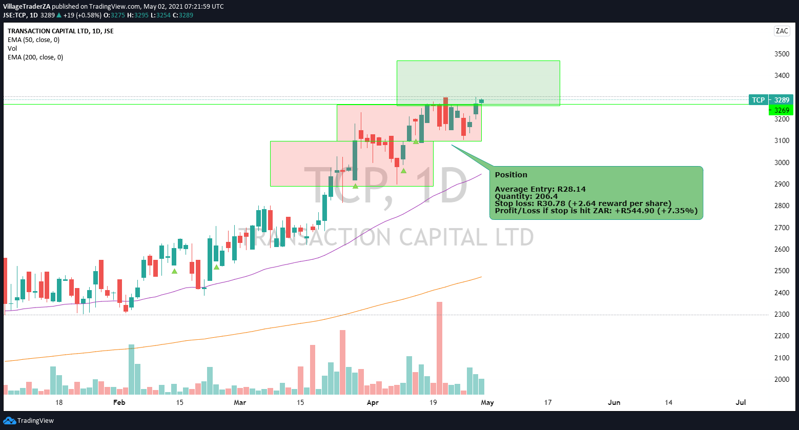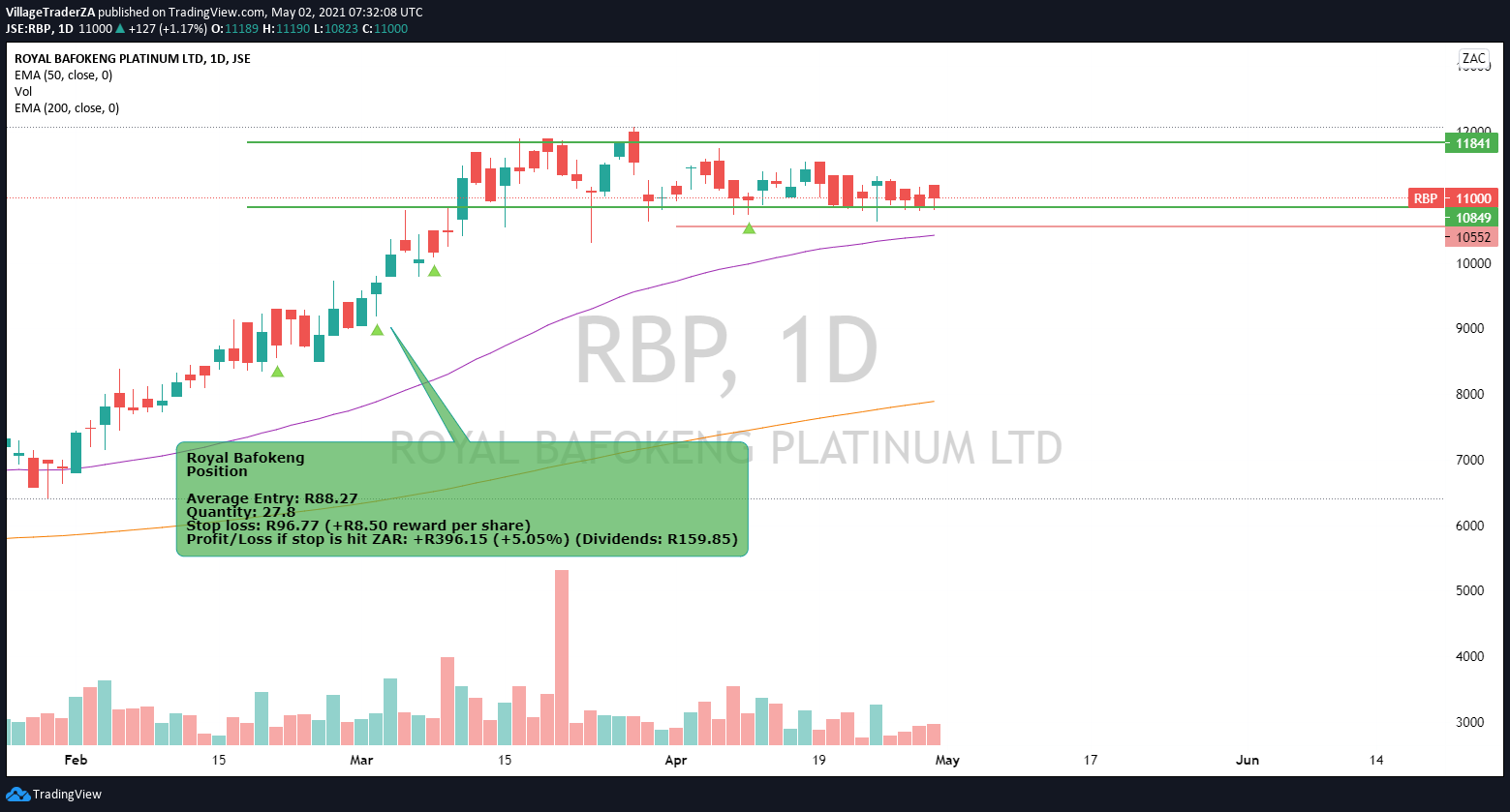 I’ve added to the position, after the stock broke higher, and trailed my stop loss to R119.58