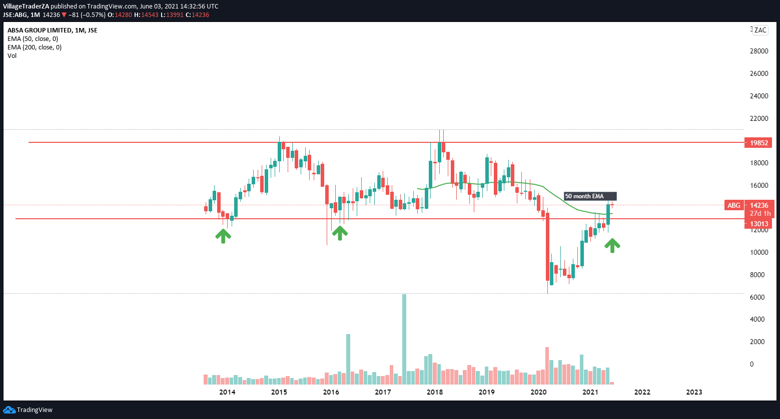 We have had a Cup and handle pattern breakout. Last week (24 May 2021 ) the stock closed through the 200 week Exponential Moving Average. After breaking, testing and holding firm above the 50 week Exponential Moving Average.