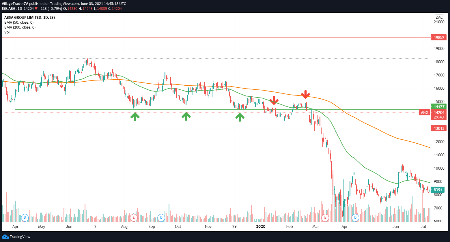The stock found some support at R144 from September 2019, which was subsequently broken, retested and and held as resistance during the “COVID-19 crash”