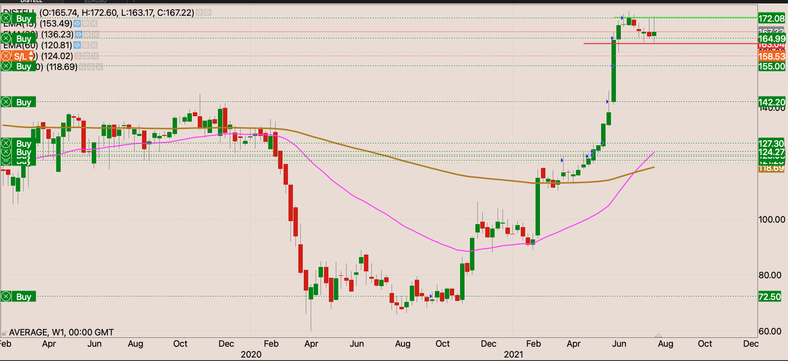 Looks like there’s a fair bit of buying happening around the R145 level. We had a nice kangaroo tail on Friday. We could see the stock move back to the R172 resistance. If the stock can break out of this range. I will move my stop slightly higher to around R161.