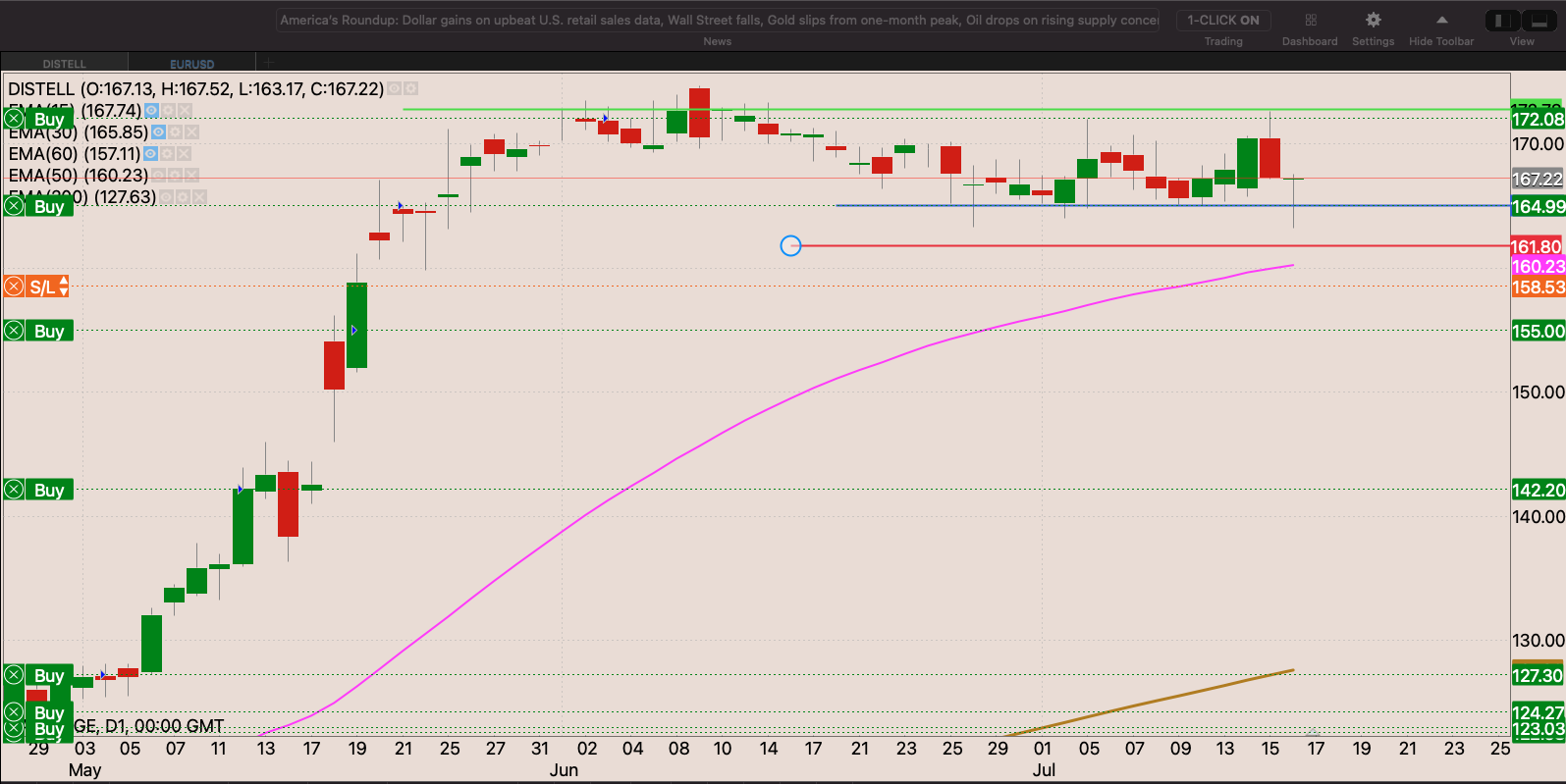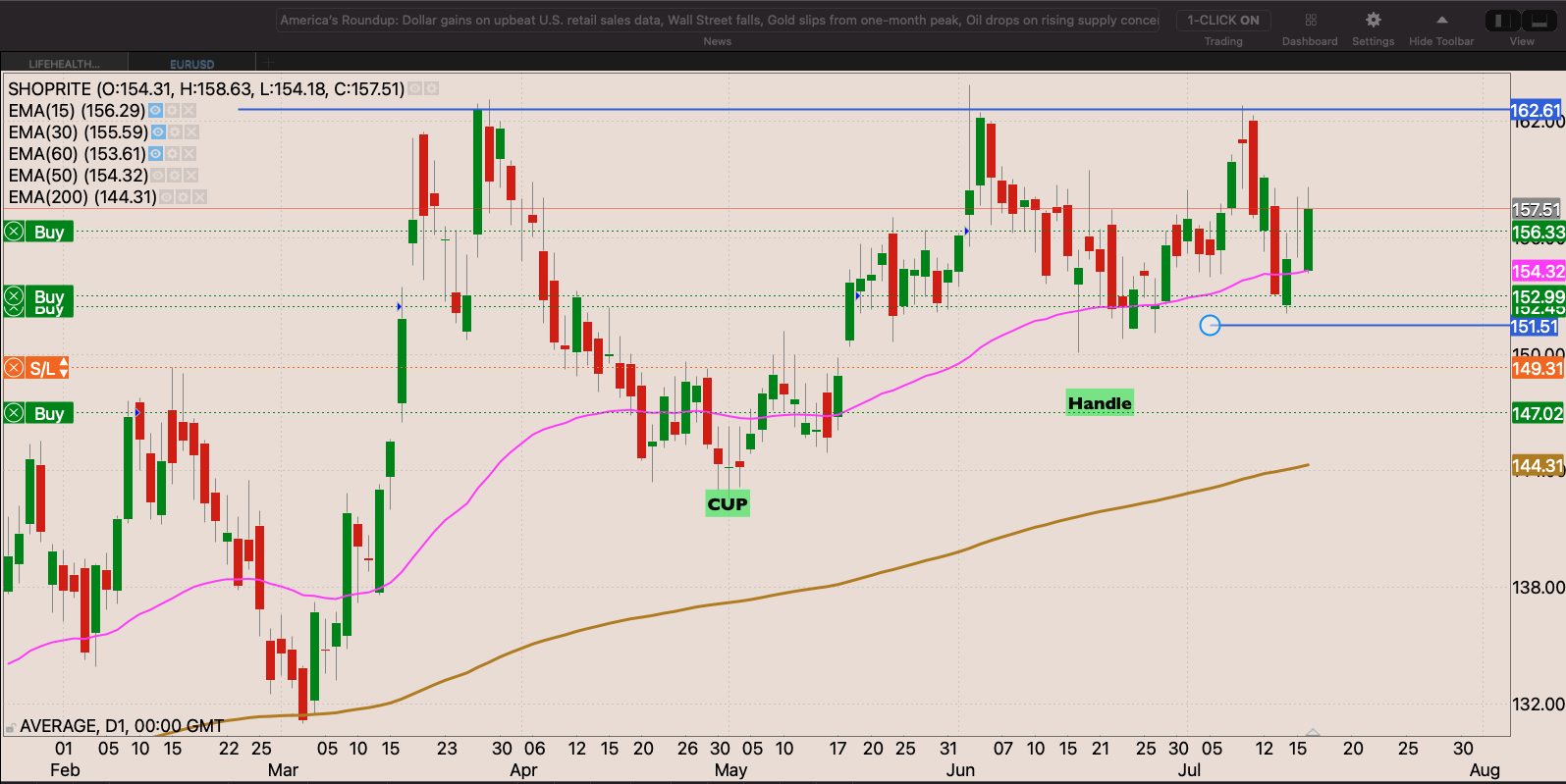 The stock tested the 50 day EMA. After a cup and handle breakout didn’t happen. Friday was a strong day in the market for the stock. With a nice strong bullish engulfing candle. I we get can through R162.60 I will add to my position with a stop loss around R151.50