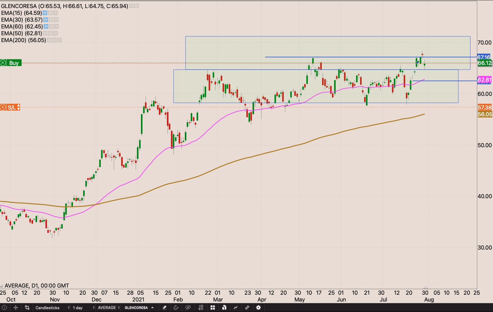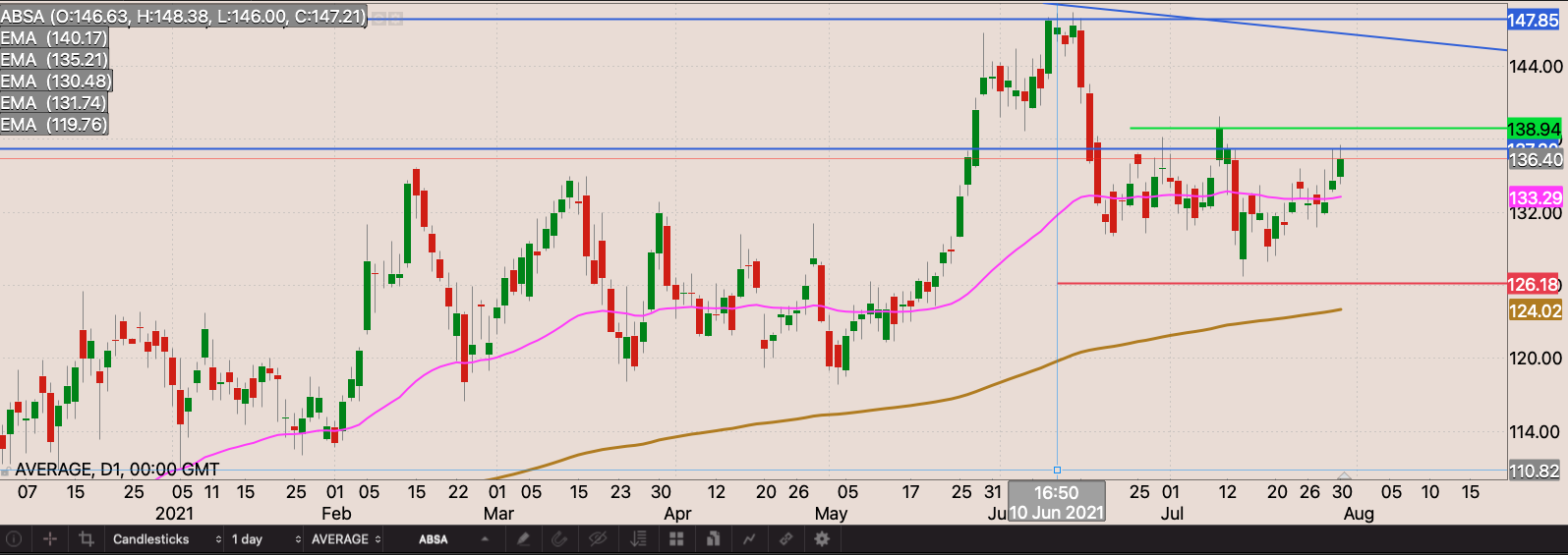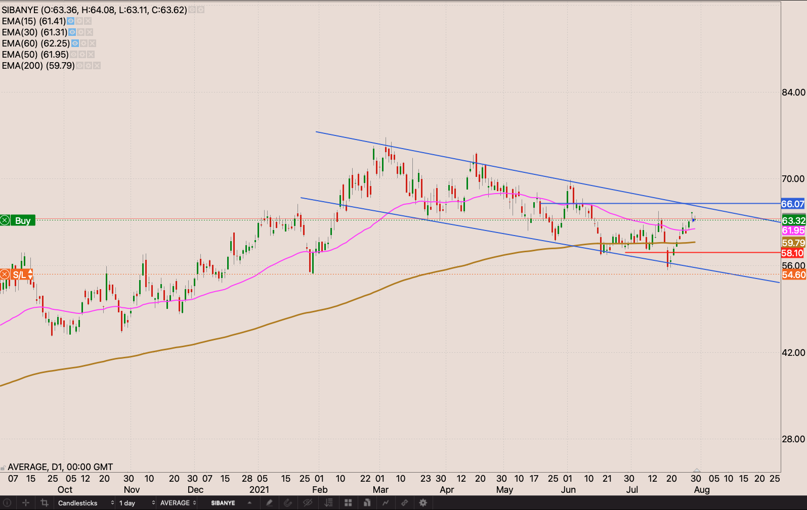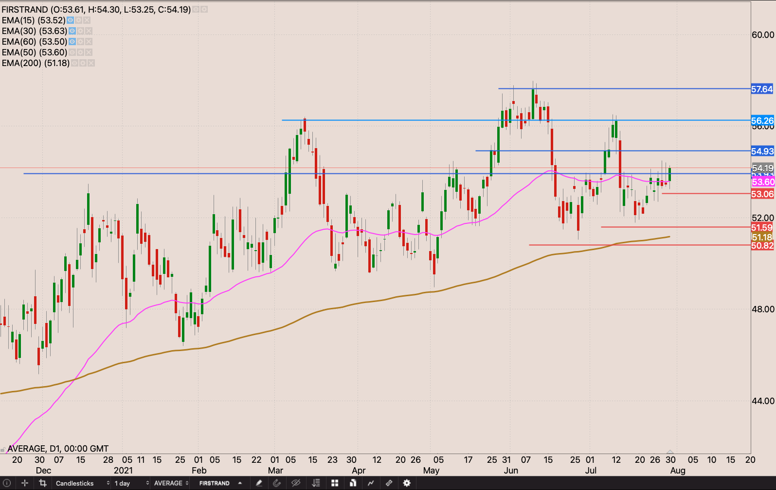 Banking stocks are starting to look good again. Buyers seem to have won the battle at the 50 day EMA. I’m going to start building my position at the open on Monday 2 August 2021. I’m going to buy 23 shares will an initial stop loss at R50.82. I’m also watching the following key levels R55, R56, and R57 to build the position. R50.82, R51.60, & R53 being defence prices on the way up