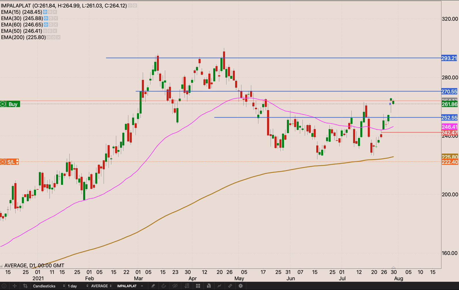 The commodity run continues with Impala joining the party repelling the 50 day EMA. If we get a close above R270 I will add to my position with a stop loss at R242.40, Then wait for the R293 resistance.