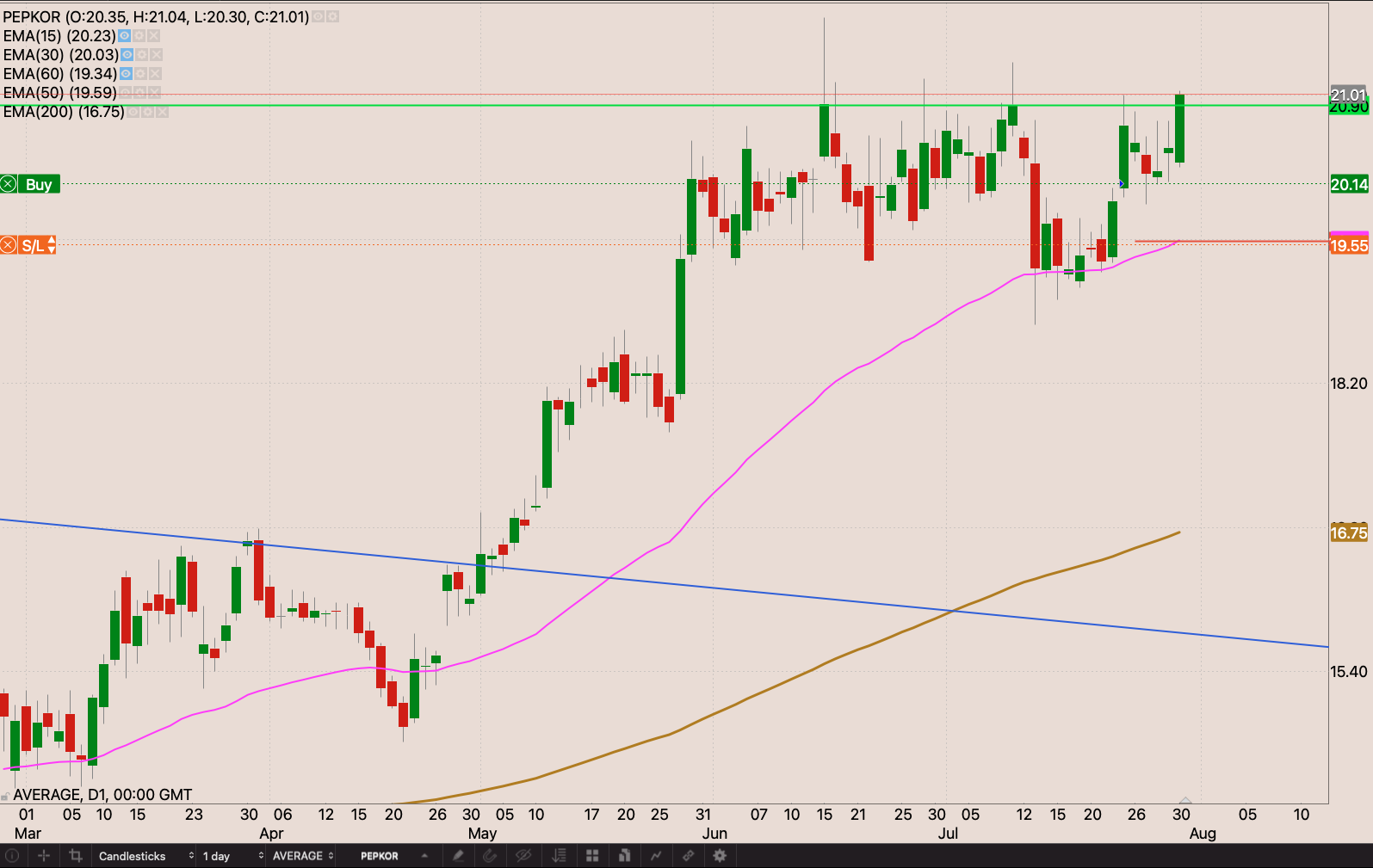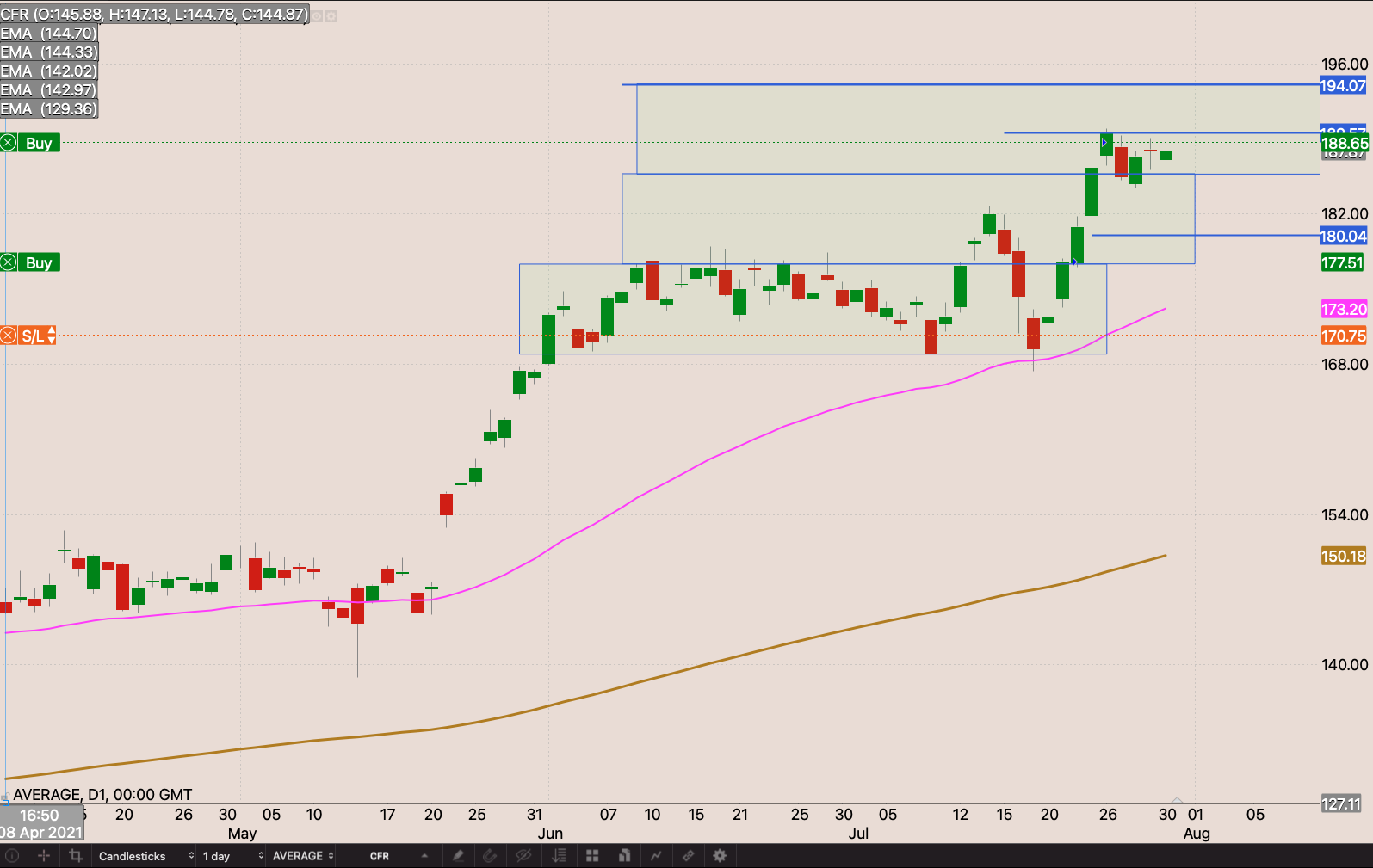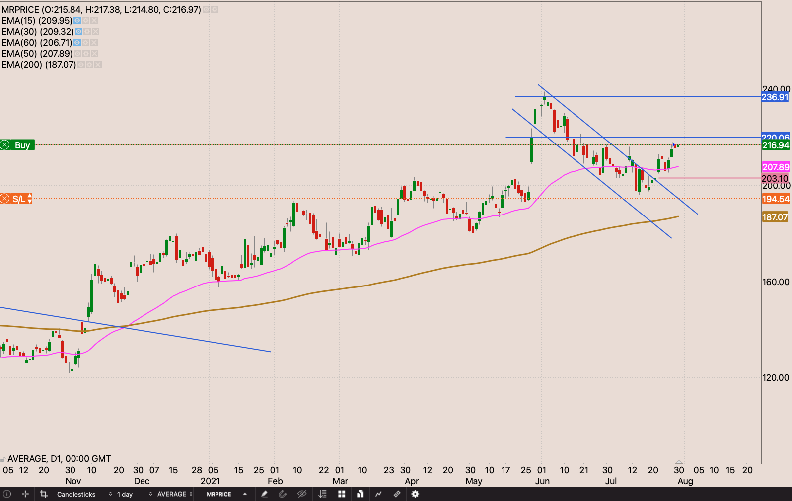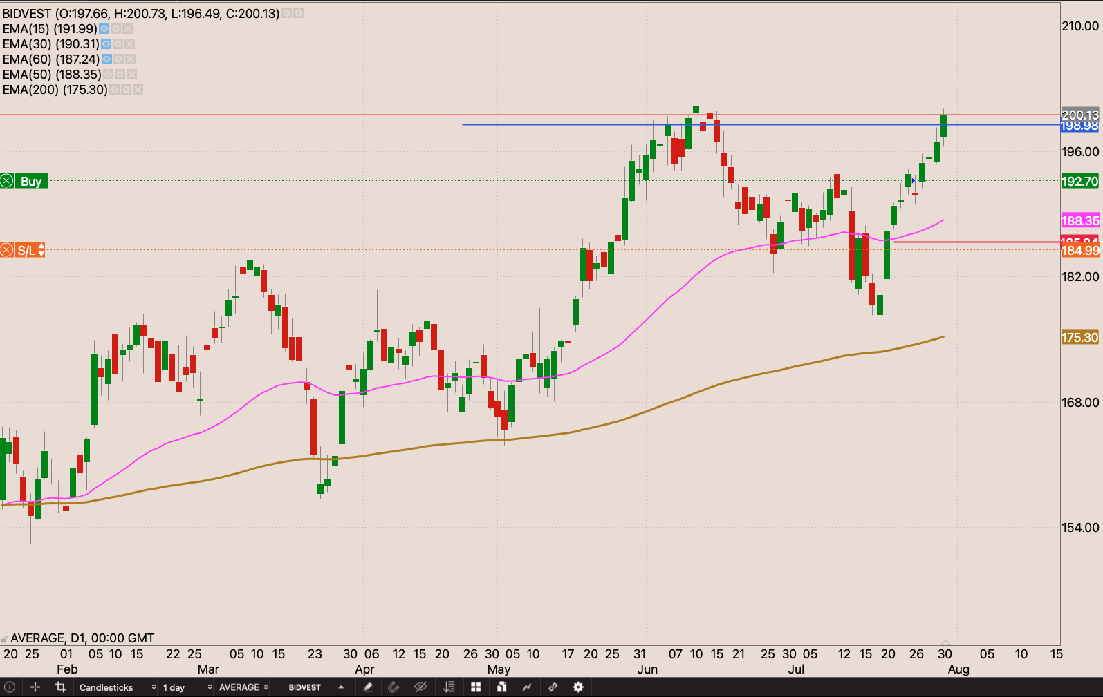 The stock had a stellar week, the stock quickly taking out the R198 resistance level. I pulled my stop to R184.99 just below the 50 day EMA. I will add 1.2 shares to my position market open on Monday 2 August 2021