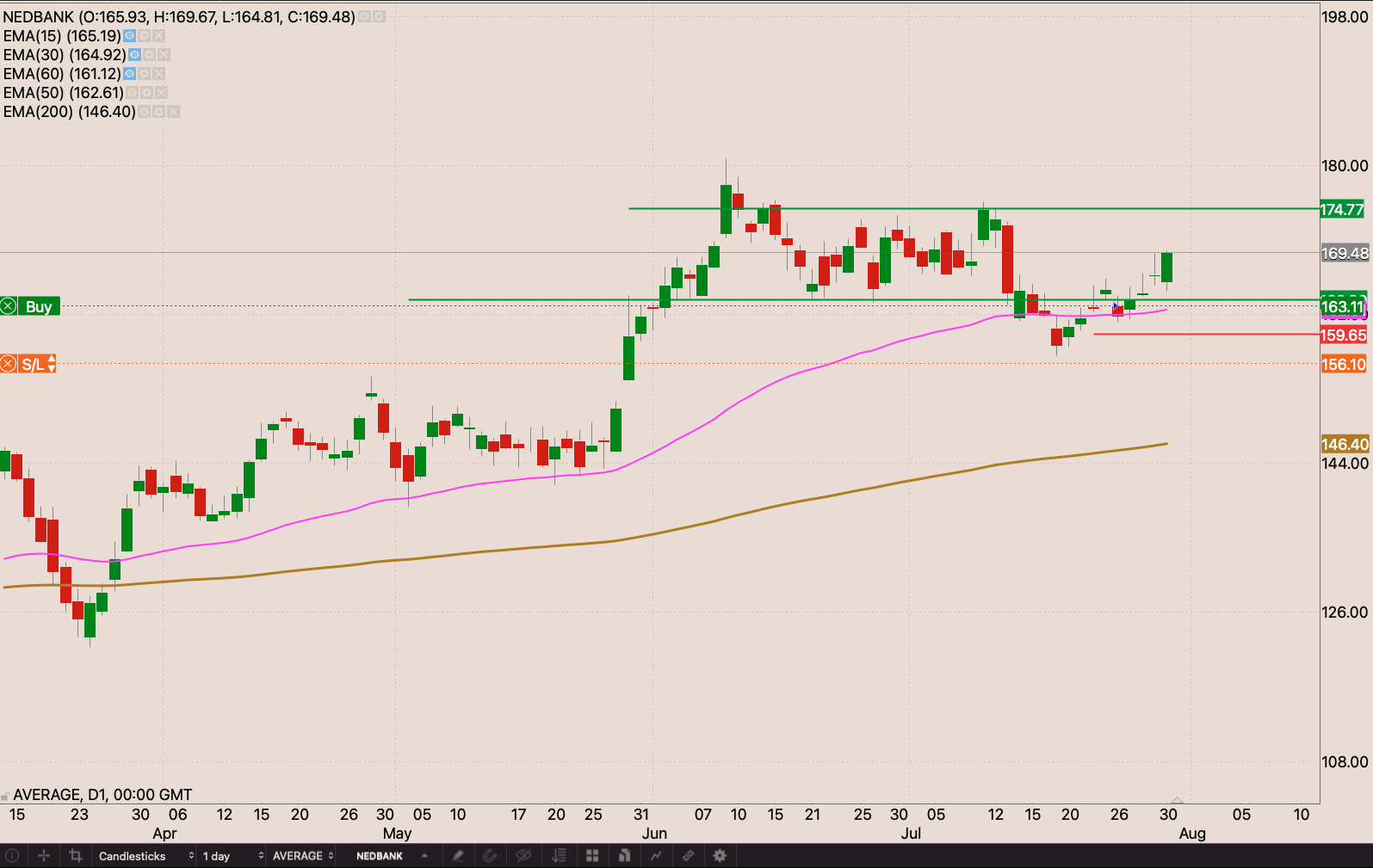 It was quite a positive week for Nebank this week. After the Stock shrugged off the 50 day EMA, ending the week wing a nice nice string bullish engulfing candle. I’m now waiting for a close above R174.70 to add to my position.