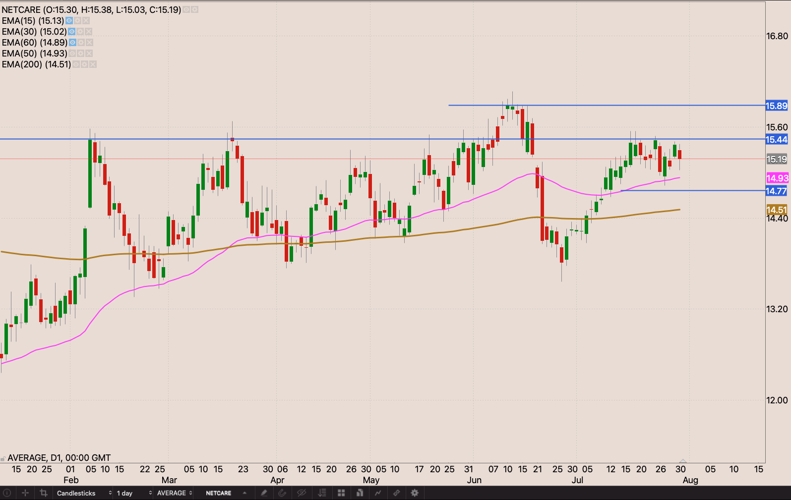 There’s a fair bit of seling at R15.40 holding the stock off. If we can get a close through the R15.44 resistance I will start building my position. With a stop loss at R14.70, and again above the R15.89 level.