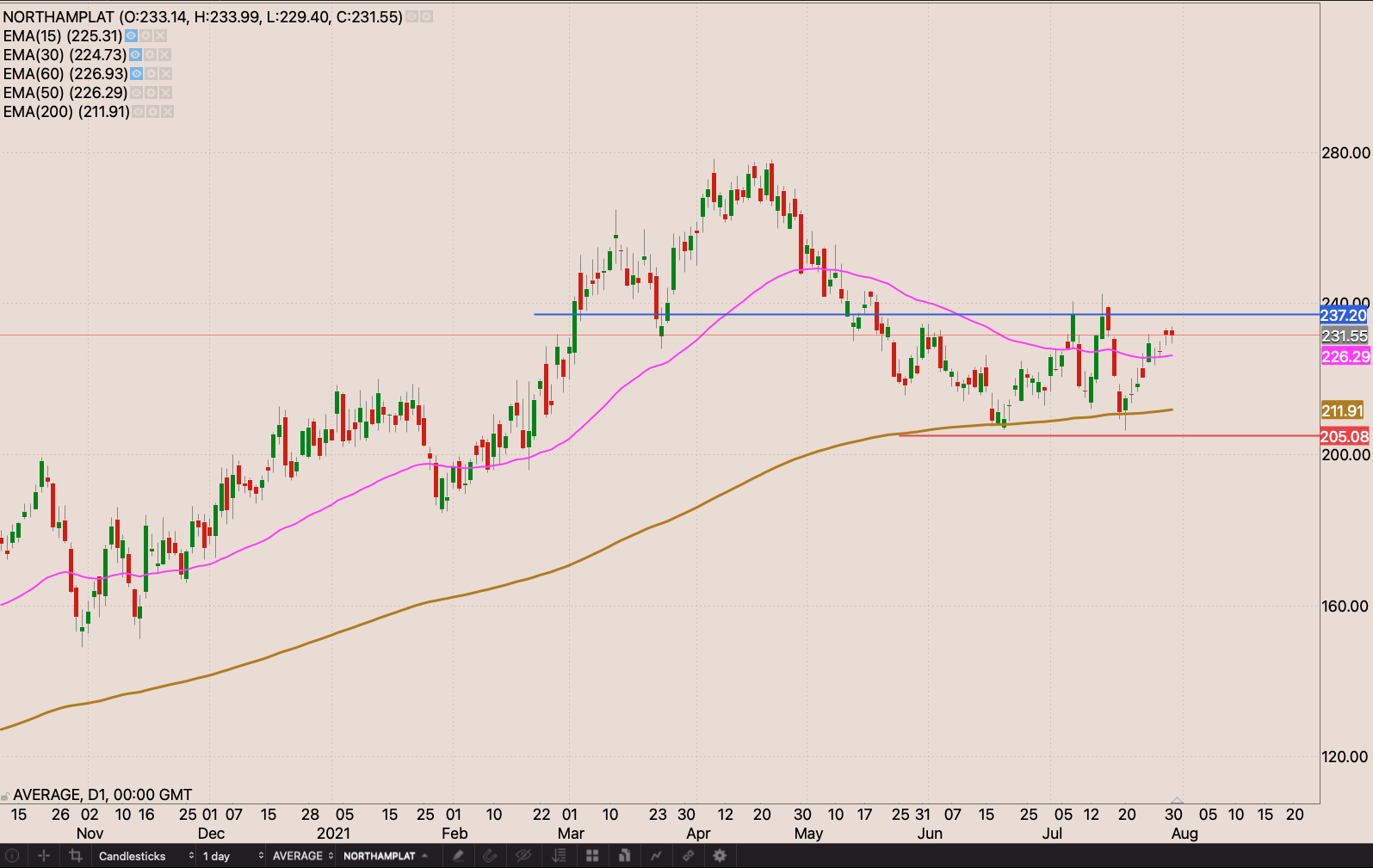 Northam is back above the 50 day EMA, after holding the 200 day EMA. I’m waiting for a close above R273.20 to start building my position with an initial stop loss at R205