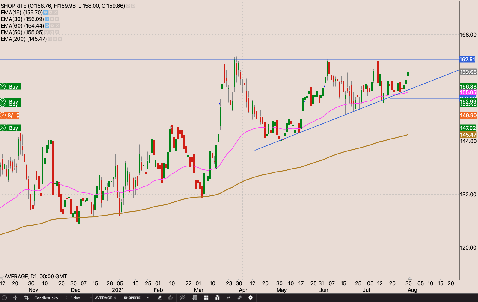 A slightly faster paced ascending triangle pattern forming on Shoprite. I’m waiting for a break through the R162.50 level to add to my position and trail my stop loss to R153.50 just below the 50 day EMA.