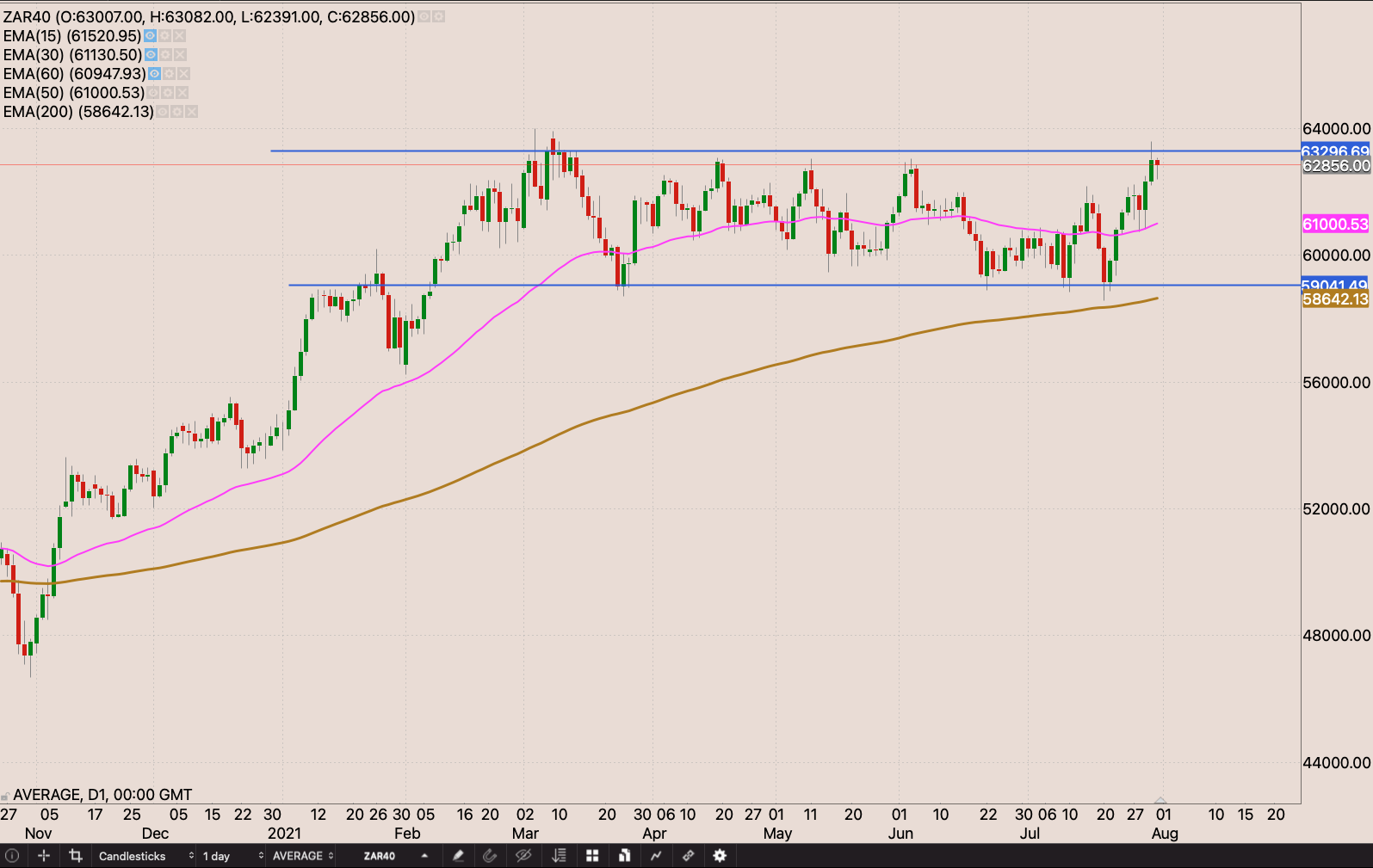 The JSE market looks quite strong this week. We could see the top40 finally breaking through the 63k points resistance. Commodities look like they are going to lead this next phase of the bull market. We see strong numbers coming from the sector and giant dividends being announced. The banks are also looking like they’re ready to run as well. A similar theme amongst the retailers. Overall looks like it’s going to be a rather positive week in the market in the market week.