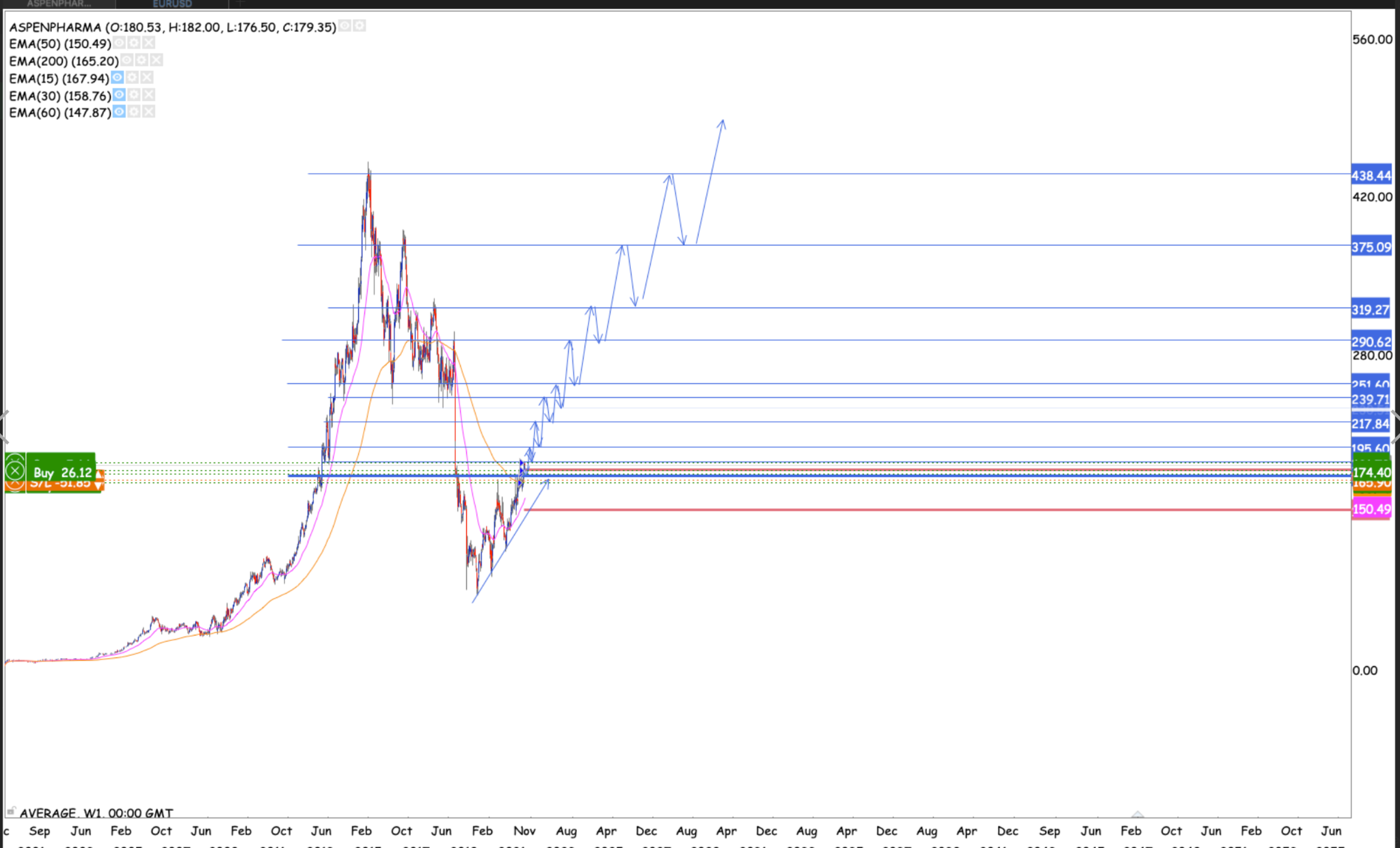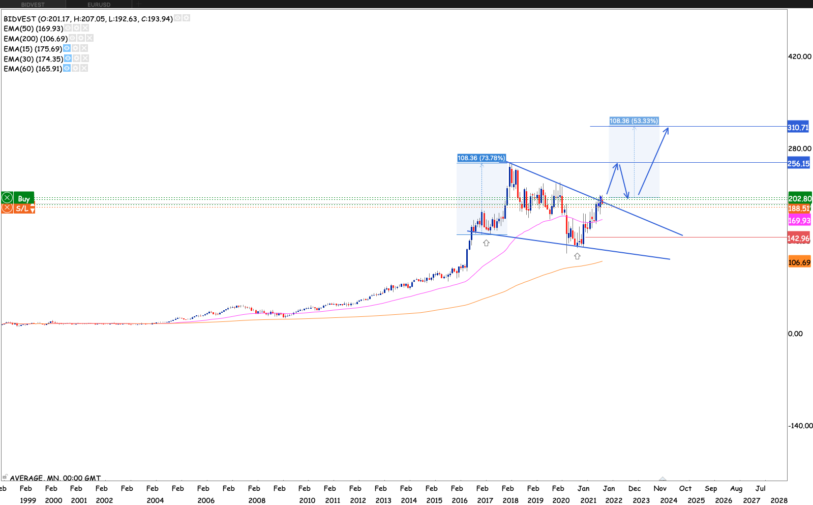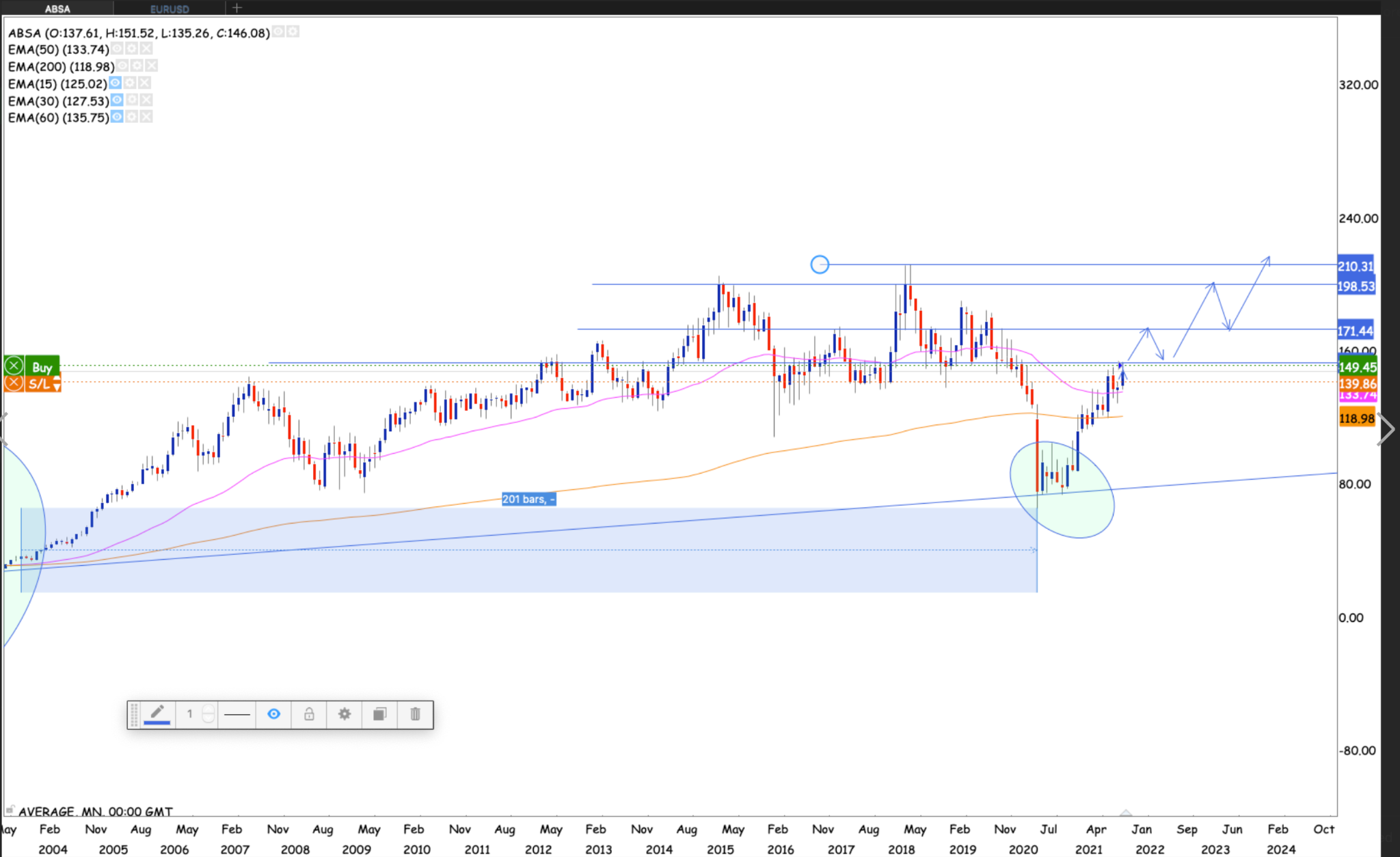 Apsen looking really good. Already having have broken the neckline of the multi-year ascending triangle pattern. Also breaking the 50 month EMA while at it. Levels to watch out for is R250, R290, R319, R375, R438