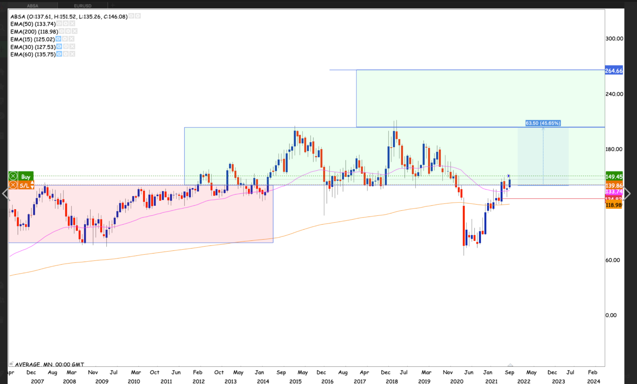 Looking at the long term picture of Absa. The stock tested the longer term trendline for the first time in about 16 years . And it took a global pandemic to get it there. Held firmly and bounce off the trendline for a much shorter time. Different markets of course, but still worth noting. The stock is now back above the 50 month EMA. If the market can get a monthly close above R150. Could be a start of a multi year bull run on Absa.
