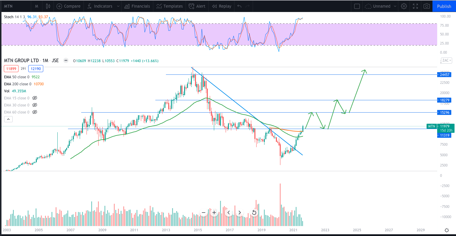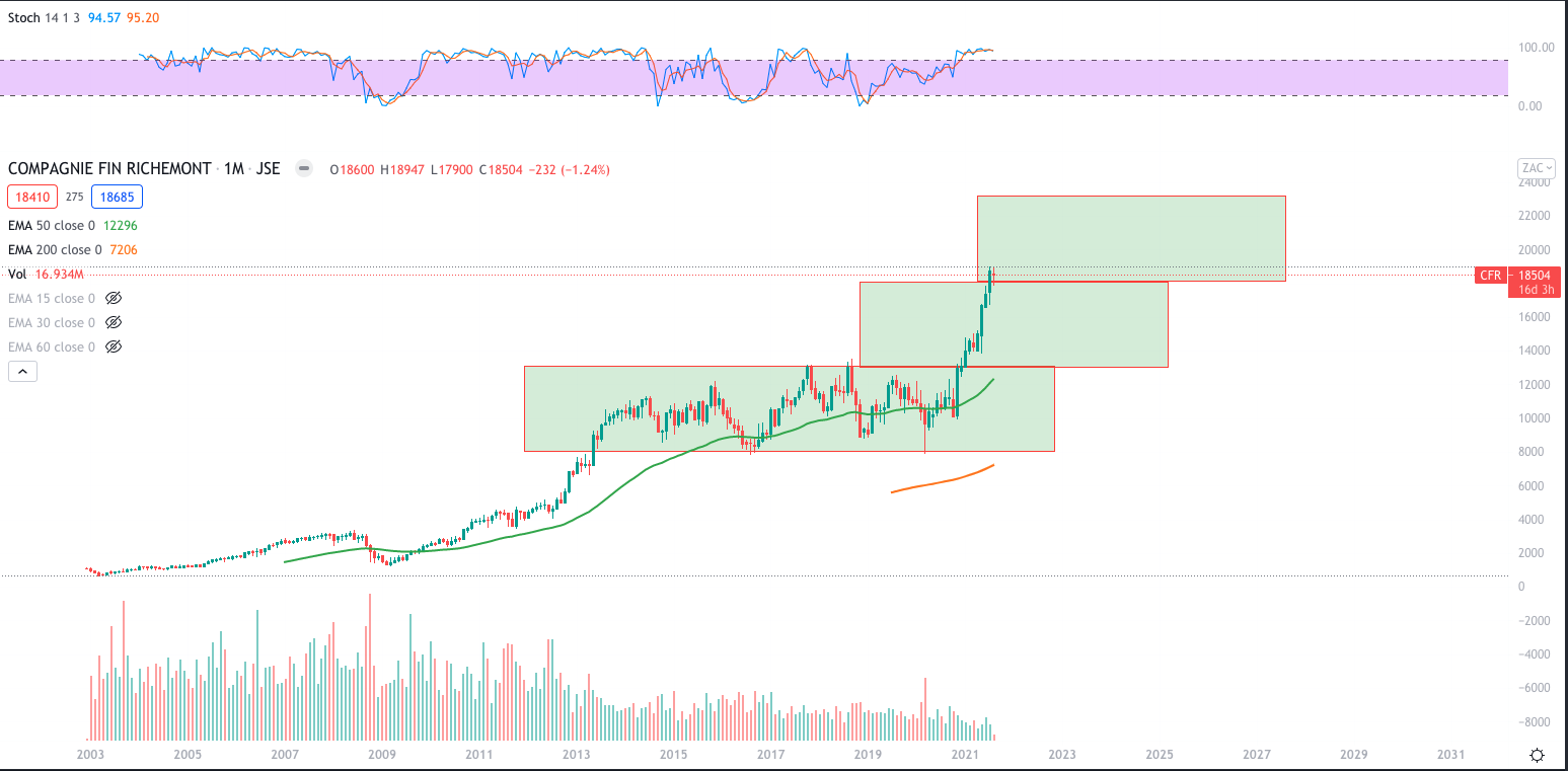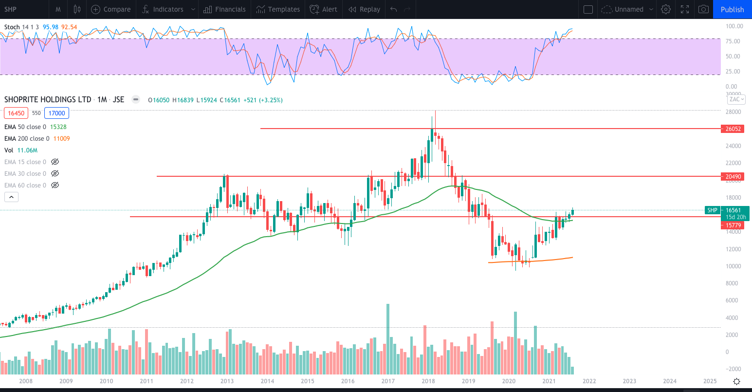 What a phenomenal run the stock had the past year tripling from the March COVID-10 crash lows. Now back above the 200 month 200 EMA, still battling with the 50 month EMA. The stock looking well poised with momentum to run some more to at least the R300 highs