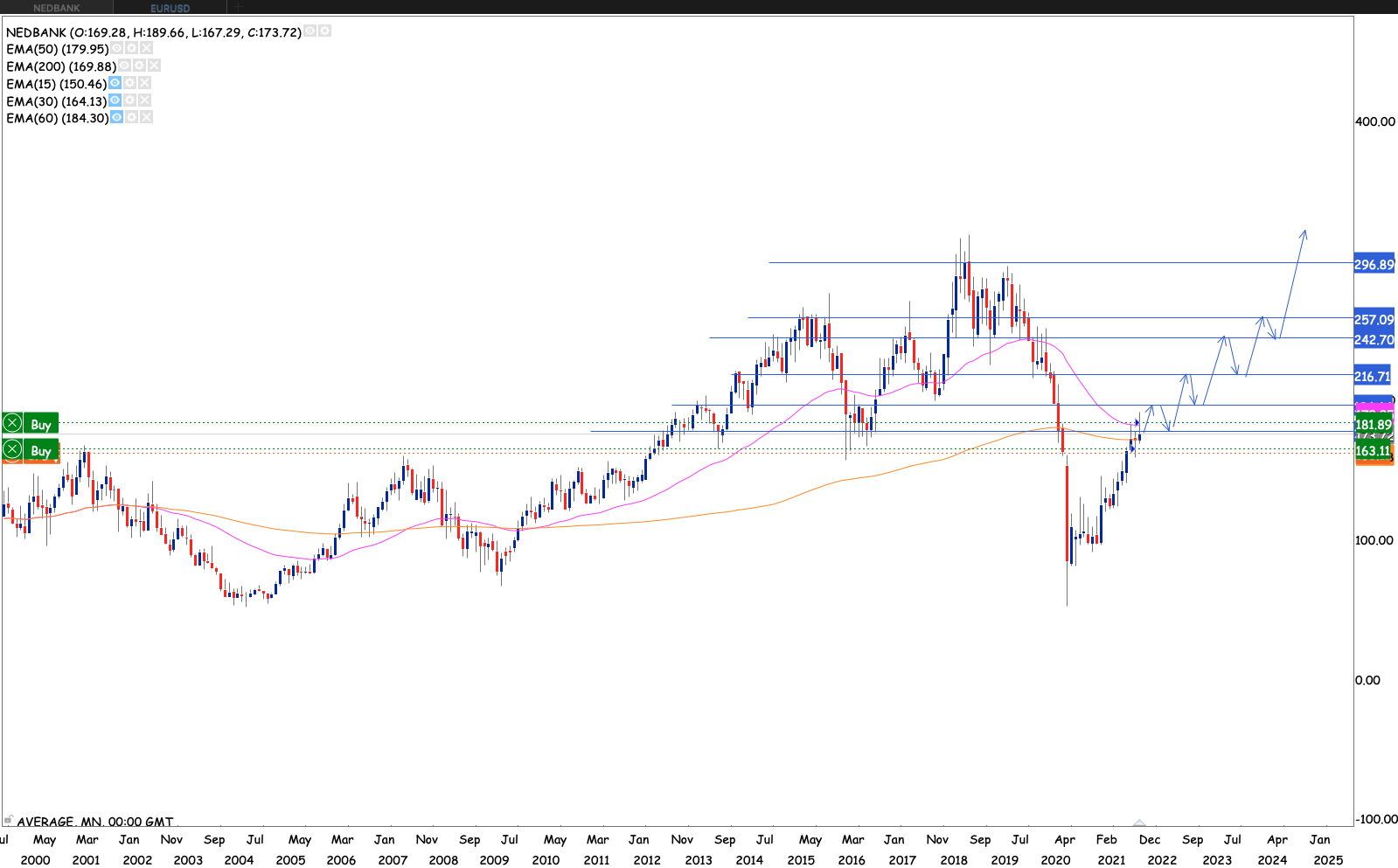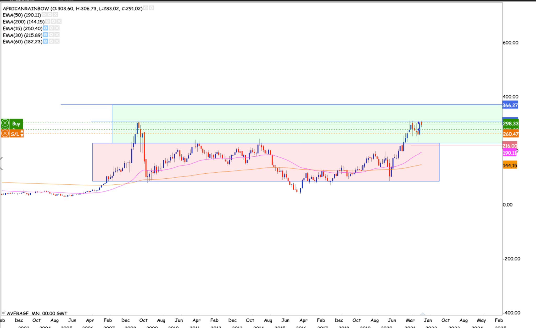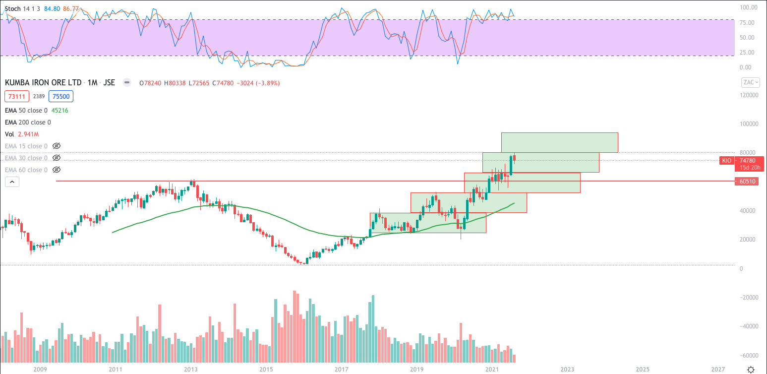 What a phenomenal run the stock had the past year tripling from the March COVID-10 crash lows. Now back above the 200 month 200 EMA, still battling with the 50 month EMA. The stock looking well poised with momentum to run some more to at least the R300 highs