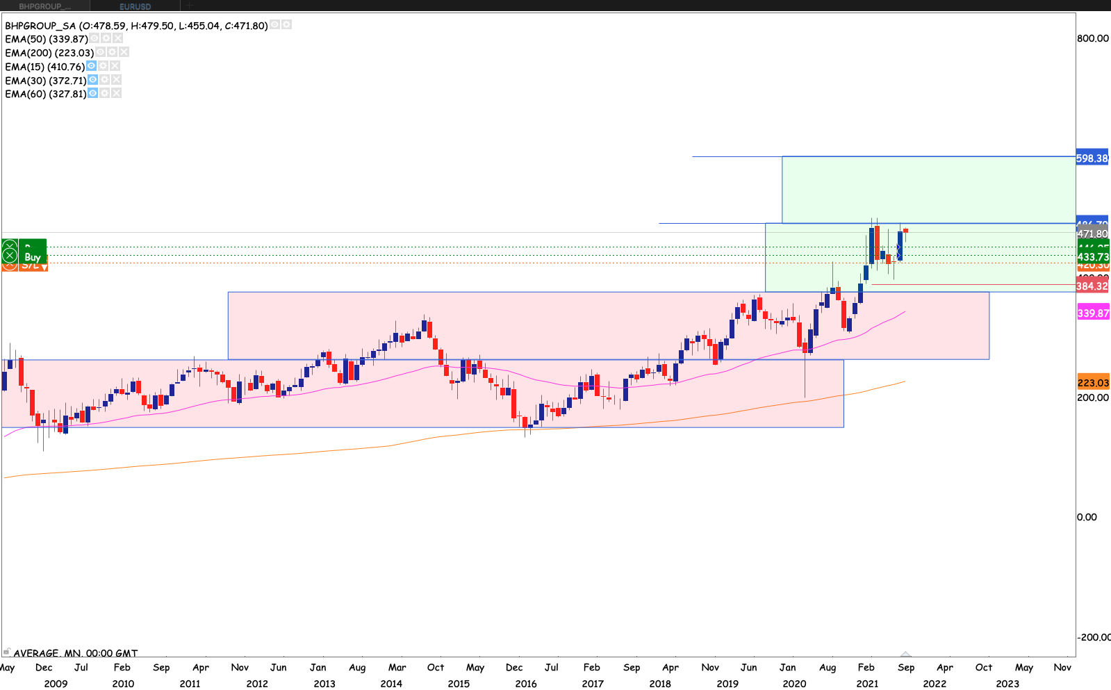 The stock looks nice with a healthy bull market. A weaker rand is another piece of wind behind the trade. The stock at the moment is knocking at the doors of the higher R486 – R598. If the stock can break and have a monthly close into the R486 box. We could see the run up to R598.