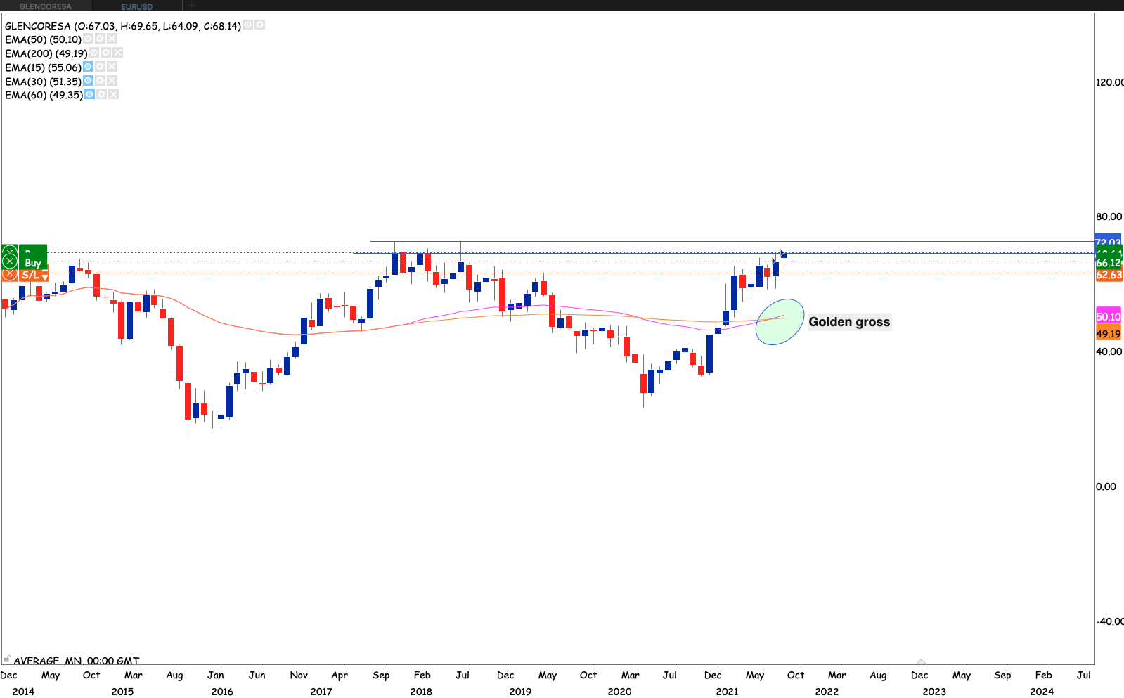 The stock is looking like its invalidating the head and shoulders pattern that was forming. closing the week off with a nice bullish engulfing candle. Staying on the right side of the 50 month EMA. We could see the stock go and test the R73 levels
