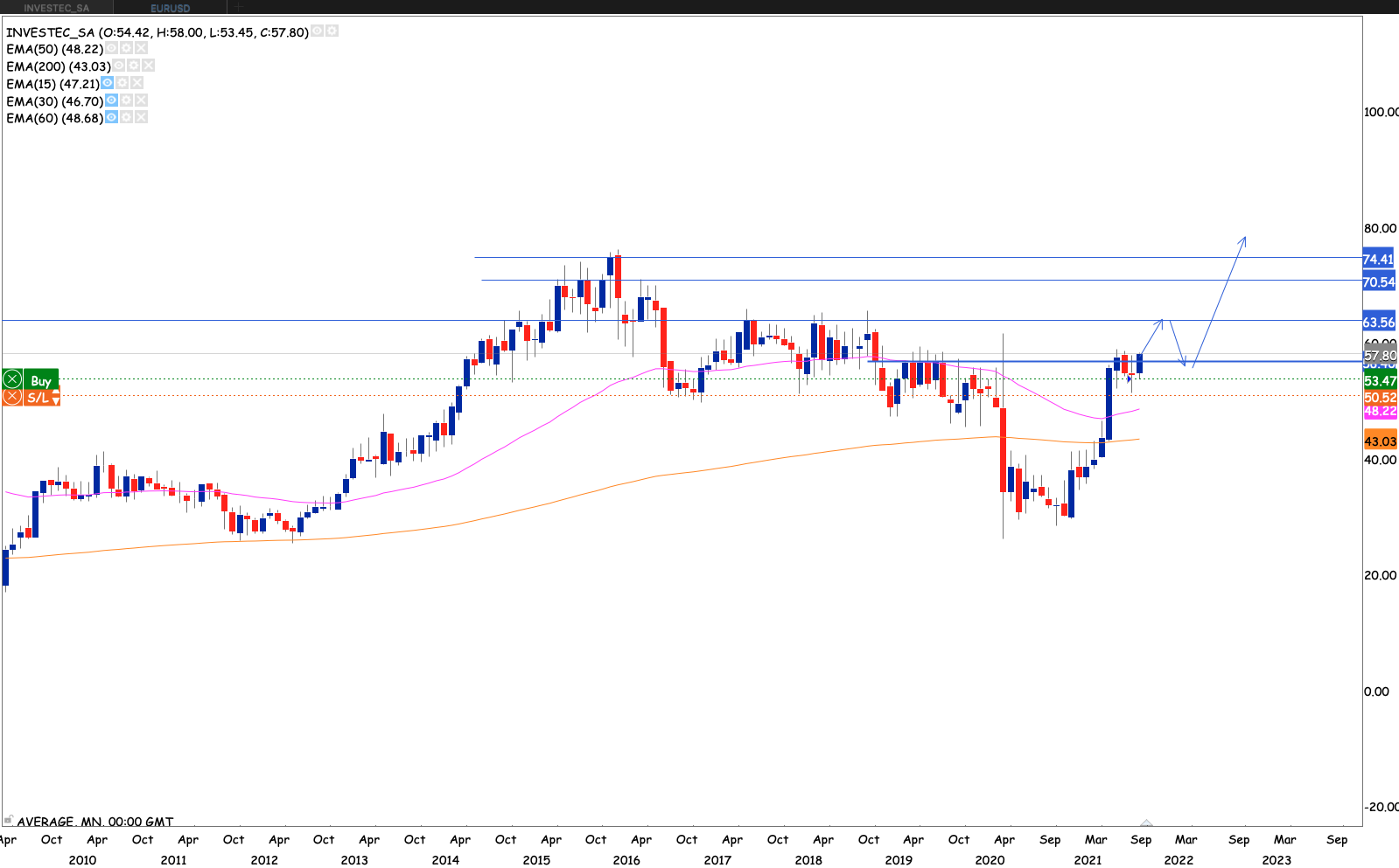 Waiting for a close above R57.63 the prior high close. Then add to my position with a stop stop loss around R54 just below the 50 EMA
