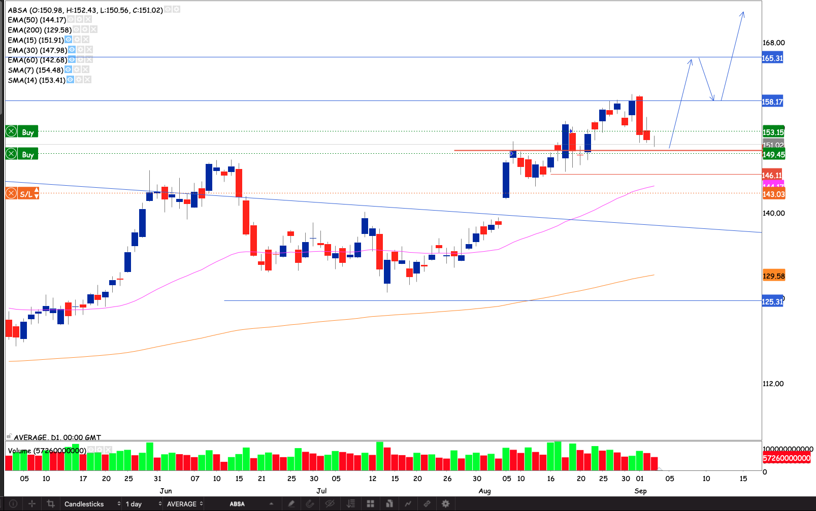 The stock found resistance at R158 the past week and a bit more. Friday closed with a doji reversal candle. An old resistance seemingly holds as support. If the stock makes a new high close with a close above R158.22. I will raise my stop loss to R146.20. If the volume increases significantly I will raise my stop to R149.45 and add to my position.