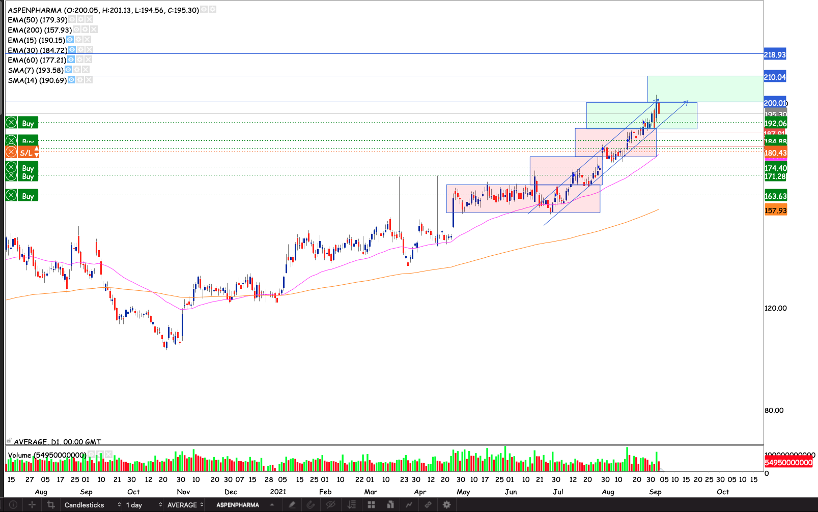 When a stock starts to move to new multi year highs. I like drawing boxes inspired by Nicolas Darvas. Aspen has been breaking to higher boxes with relative ease. The stock is currently within the R184 – R200 having just got in it recently. At the moment Aspen is at holding status. Waiting to see how the stock will behave around R200. If the stock breaks R200 it’s time to buy the stock again. While being on the lookout for continuation patterns between R184 – R200. Not forgetting a stop loss be R184 – R200 after the breakout.