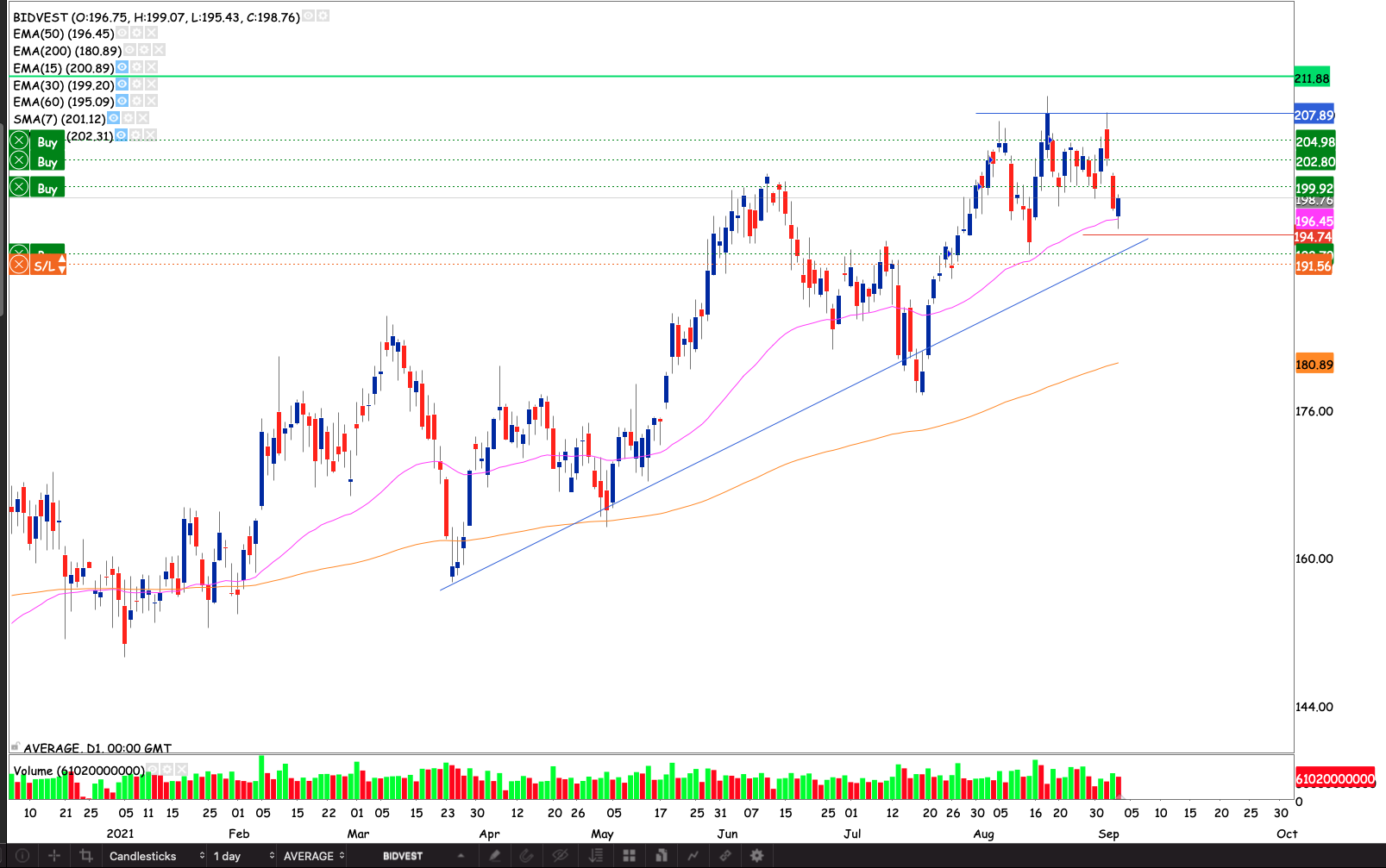 back above the R207.90 I will raise my stop loss to just be low the Friday low at R194.70 then add to my position.