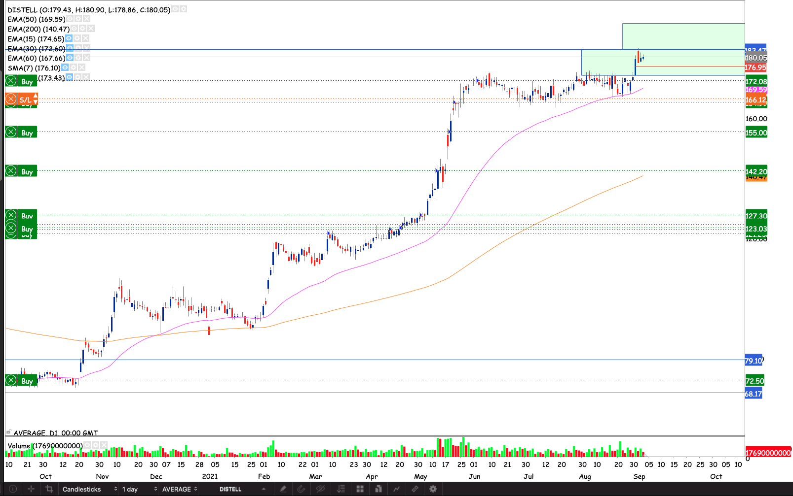 Nice broad inverse Head and Shoulders pattern the stock hanging on to the 50 day EMA. I’m waiting for the break of the neckline with a record high close above my last purchase at R185.52. Then I will raise my stop loss to R167.70 and add to my position