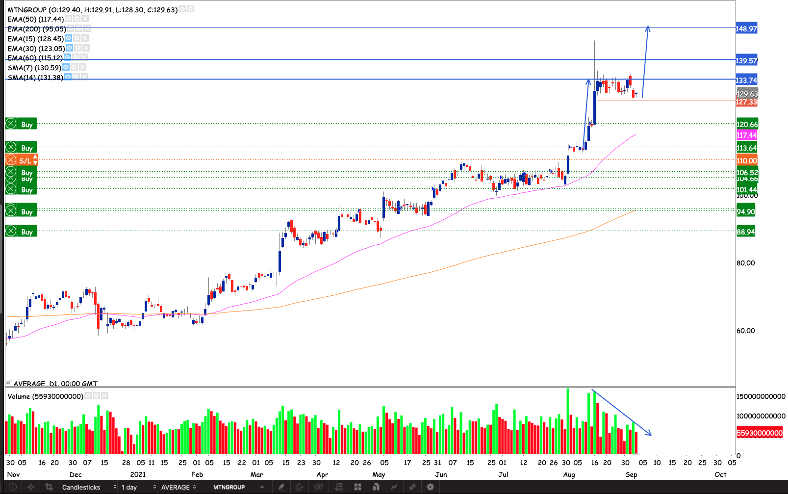 The stock has been consolidating over the past couple of weeks. Forming a horizontal bullish flag. if The stock breaks the flag’s resistance at R133.62 with improved volume I will raise my stop loss to just below the low of the flag around R127