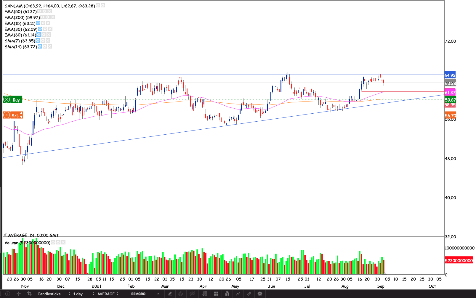 The market seem to really like the MTN & Sanlam fin-tech venture. The stock ran quite strong since the announcement. There’s some resistance around R64.90 level. If the stock takes it out I will raise my to R59.50 and add to my position.