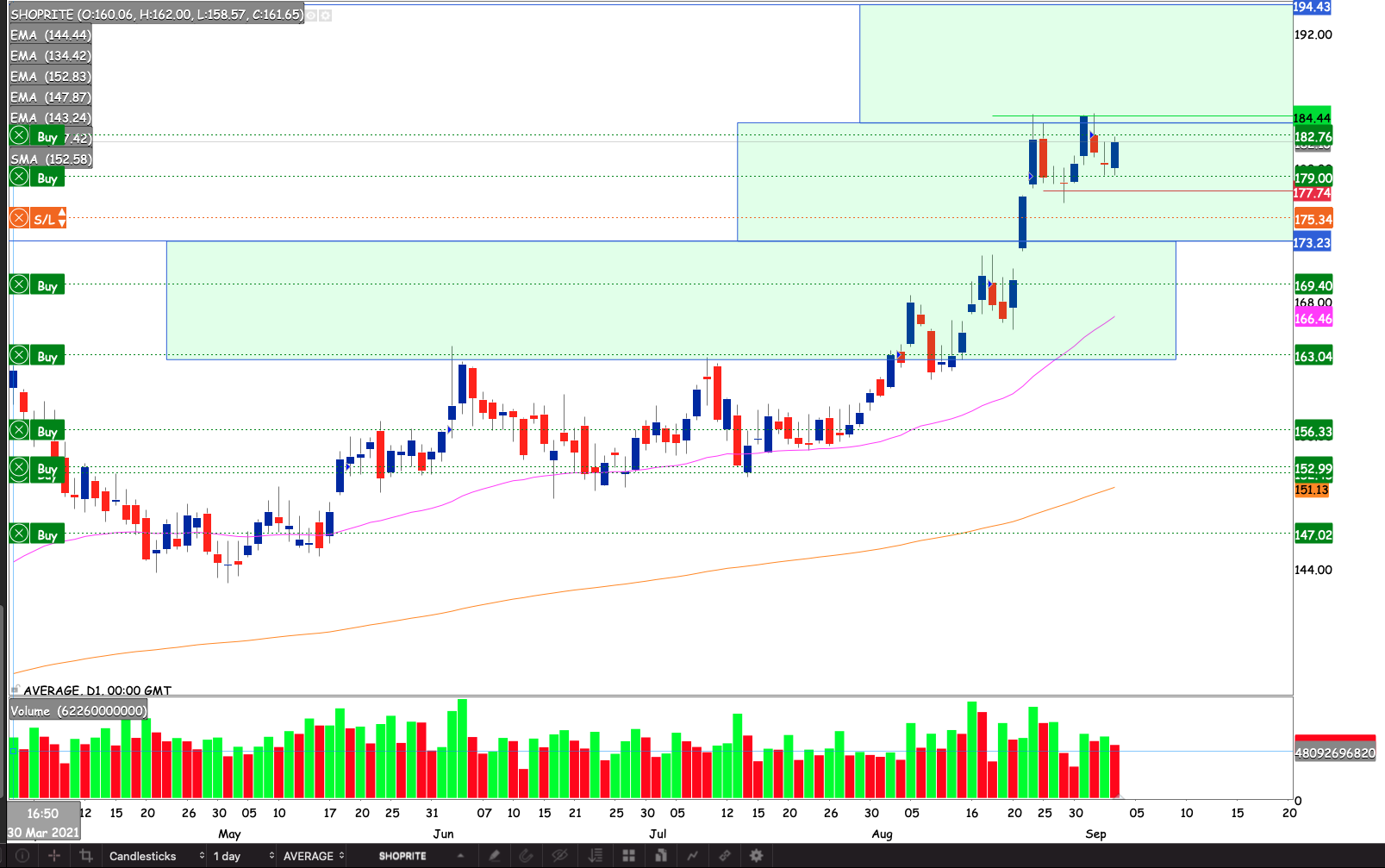The stock tested the doors of the higher box and slipped back. Friday closed off with a bullish engulfing candle . If the stock moves back to the higher box with a close above R184.43. I will raise my stop loss to around R177.70 and add to my position.