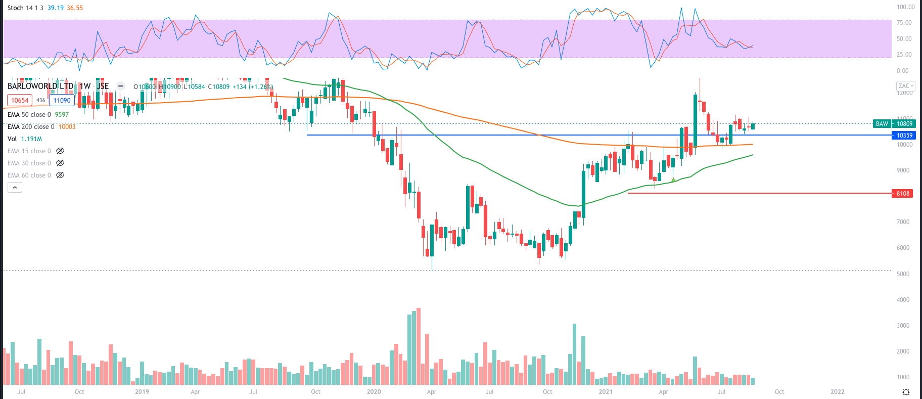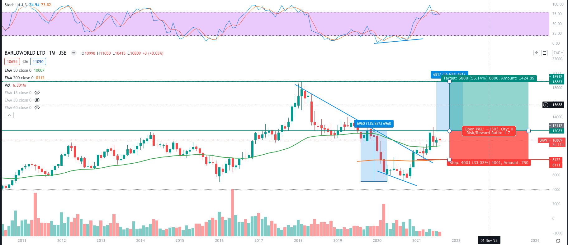 Classic Cup and handle pattern on Barloworld. The base formed on declining volume meaning the selling that brought the stock to the R41.88 low had been slowing down. As we do when changing direction coming to a full stop. The lower low of September 2020 was not followed by a lower low on the stochastic oscillator. A bullish Divergence is a classing reversal chart pattern. What has happened since? The stock proceeded to make higher lows and higher highs. Breaking the down trendline. All this while holding a 50 month EMA. With a long term stop loss below the R41.88 say at R41.80 and a potential target at R188.60 a 1.7 risk:reward ratio. Seems pretty small until you find out that. That results in a 56% price gain. Time will tell