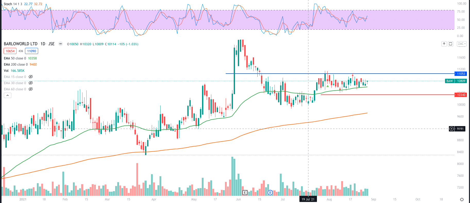 So what’s been happening lately? Well let’s look at the daily chart to find out. The stock has been making higher highs and higher lows. Current 52 week high close at R124.30 but the stock since retranced about two thirds of that gain. Held the 50 day EMA as support quite well. Forming yet another cup and handle pattern, whose target is R124.30 (Entry for the “wind at the back trade”). With a stop loss just below the handle R103.50 not a bad 2:1 risk-reward ratio for a short term target. If the stock can break and close above R110.50.