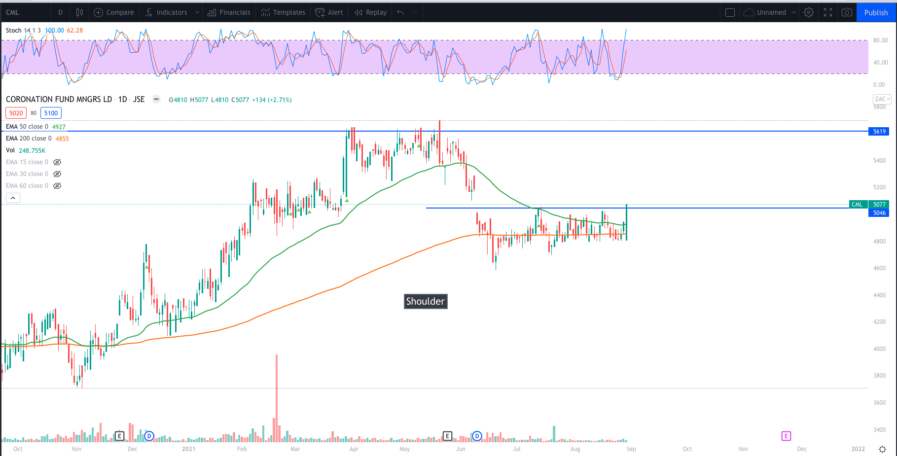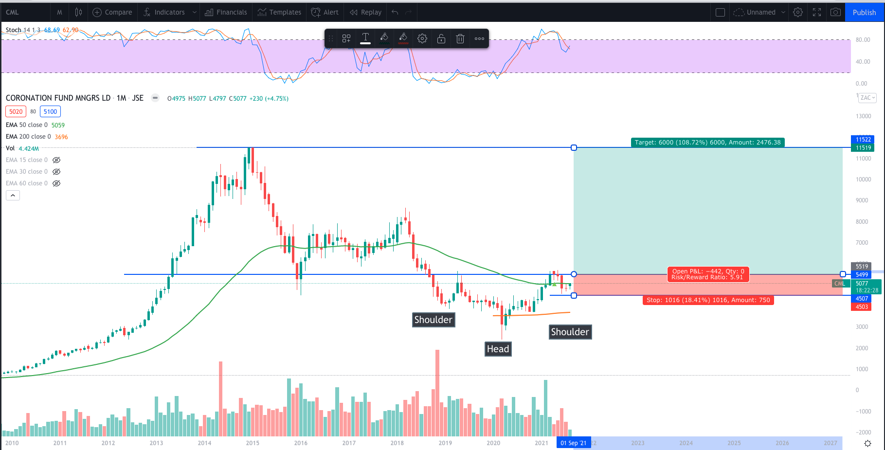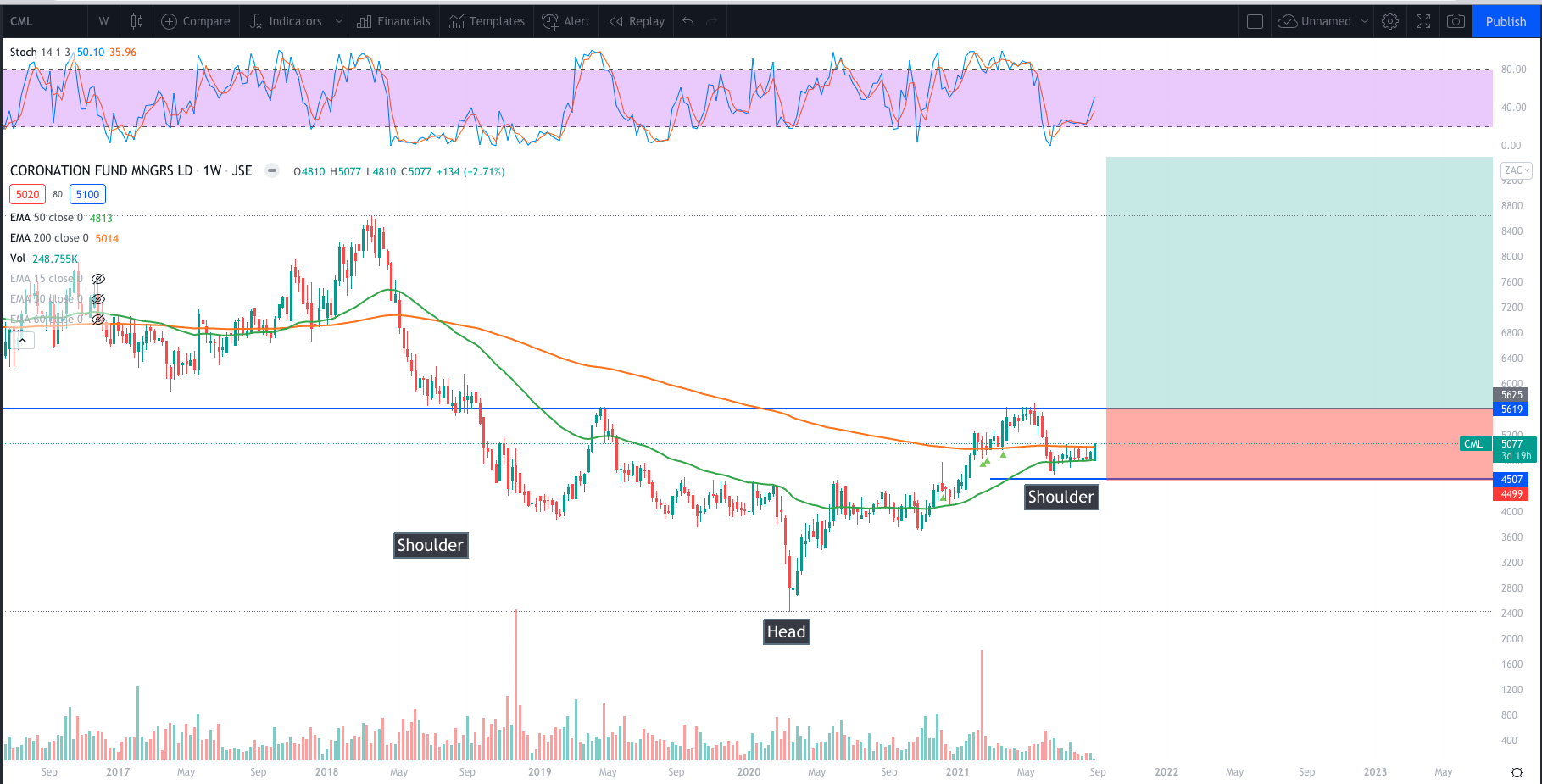 The stock broke out of the “war’s” range with a bullish engulfing candle. Engulfing pretty much the entire range. Closing back above the 50 day EMA. On Monday 30 August 2021 Good time to start building a position with an anticipation of the head and shoulders trade. That provides a better risk reward opportunity of about 16. If the stock then closes above R55 then continue building the position.