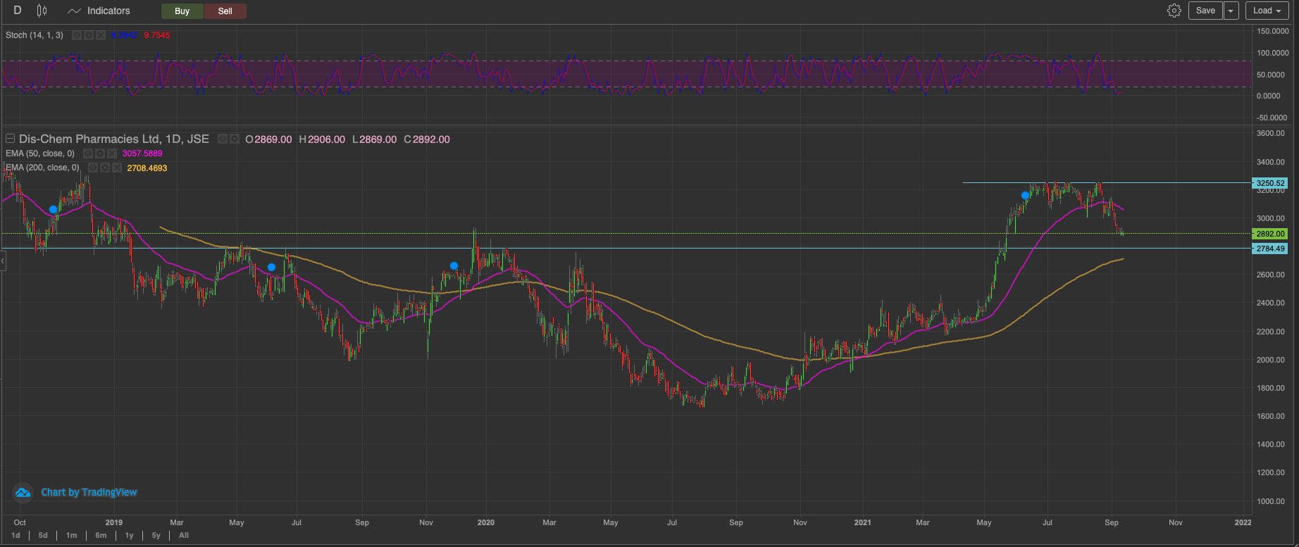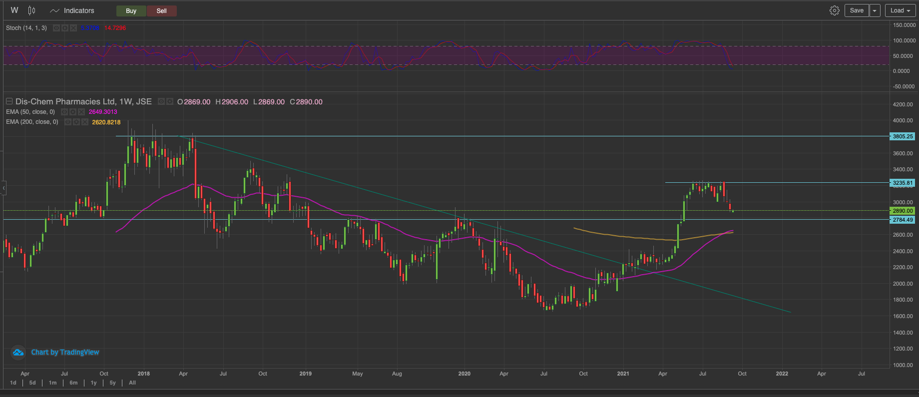 The stock lost its will to rise post the dividend. Subsequently slipping below the 50 day EMA at the back of the founding. We have to wait to see how the 200 day EMA defends the price. If the 200 day EMA holds as support, and monitoring price action around the 200 day EMA. The R27 level is a good place to start building the position. And increasing the position when the stock is back above R32.50. It’s the first time since the golden cross that the stock takes a shot at the 200 day EMA. The likelihood of the moving average holding is pretty good.