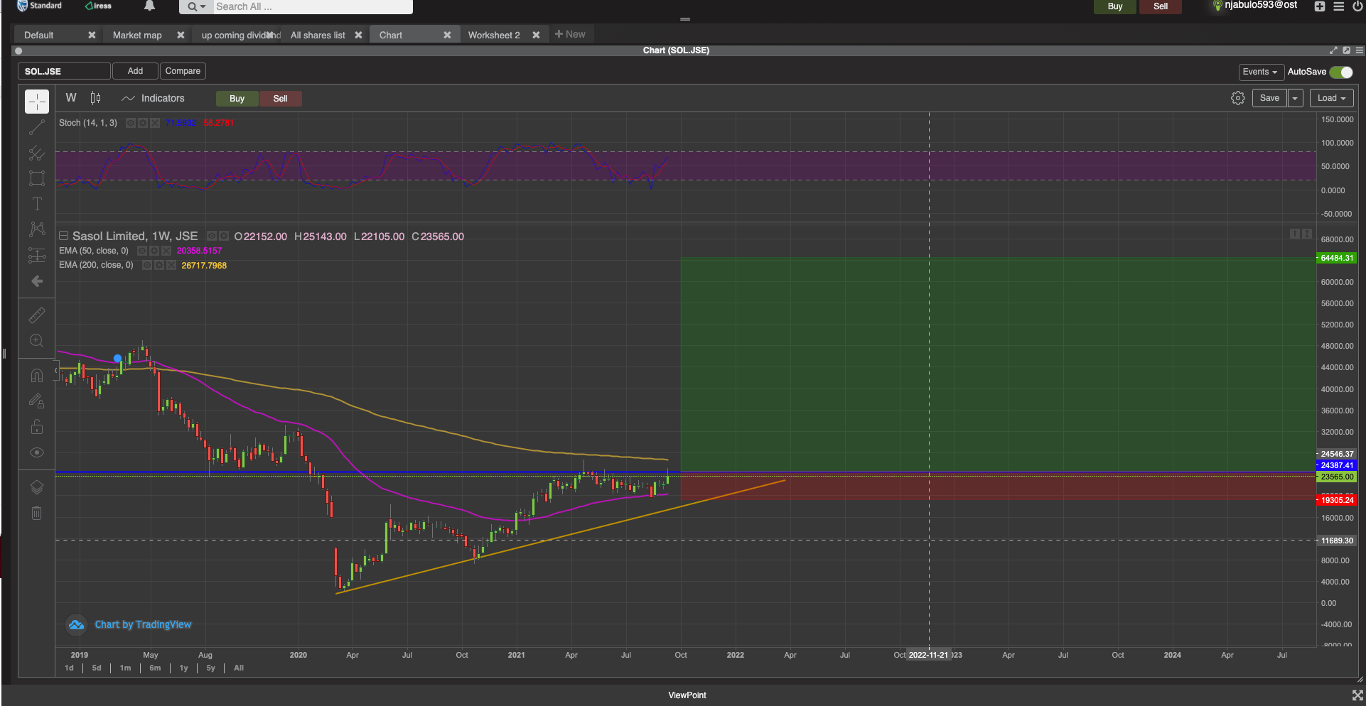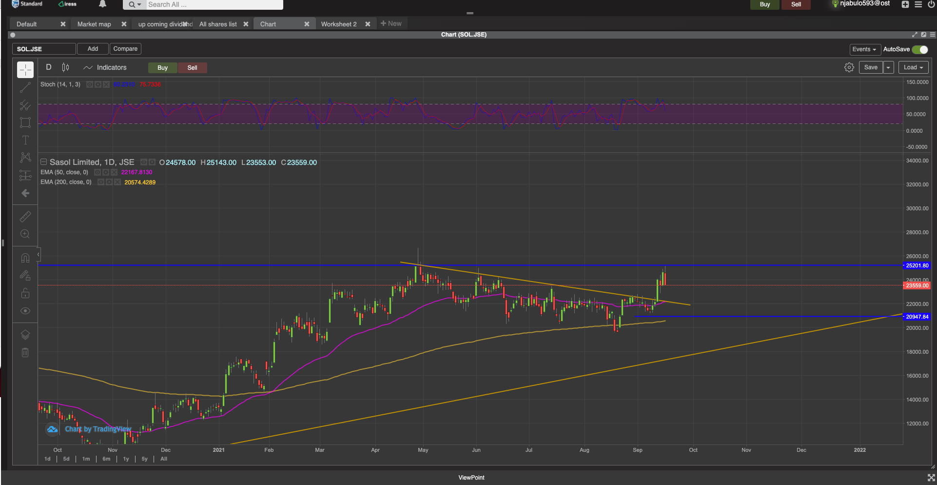The stock broke the R240 level and ran into some selling at R250 since April 2021, but the stock held both the 50 & 200 day EMAs. The market remembered the R250 level again testing it on 16 September 2021. If we can close above the April 2019 close The doji that proved to be the undoing of the rally would then confirm the trade