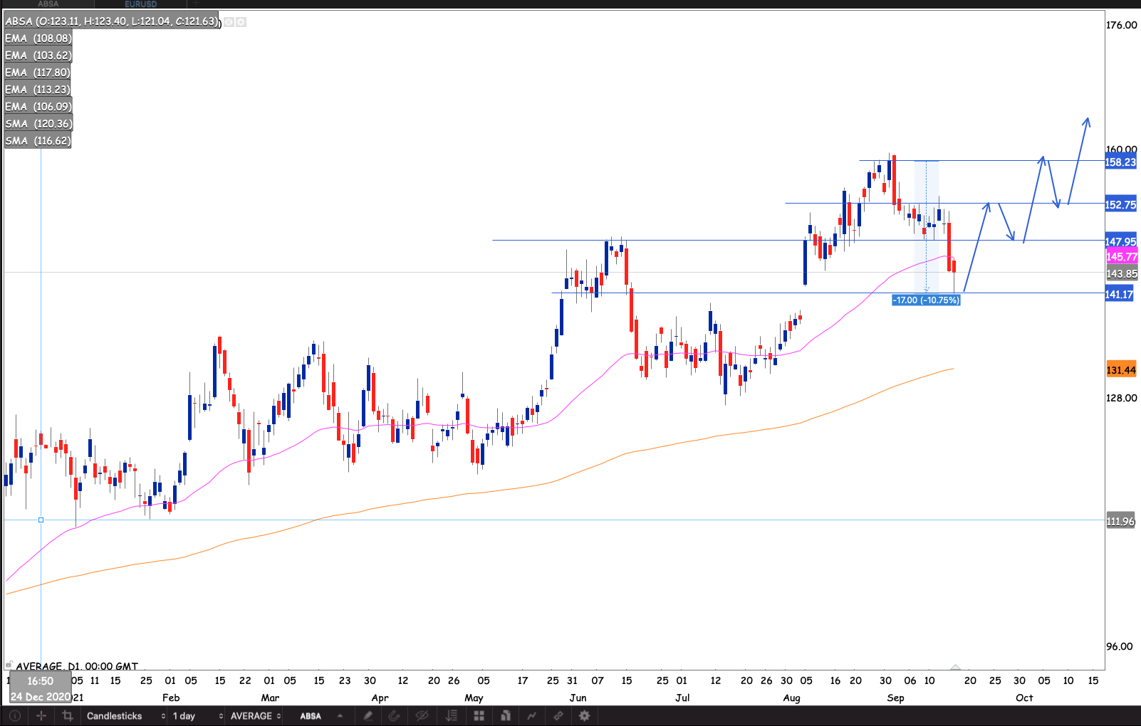 I got stopped last week on this trade as the stock violates the 50 day EMA. It did remember the R141 old support and it was a touching burning stove on Friday and that proved to be the low of the day. If the Friday low isn’t taken out with a new low this week, and the stock breaks back above the 50 day EMA. Signals the end of the -10% correction. I will however wait for a close above R148.10 to rebuild my position.