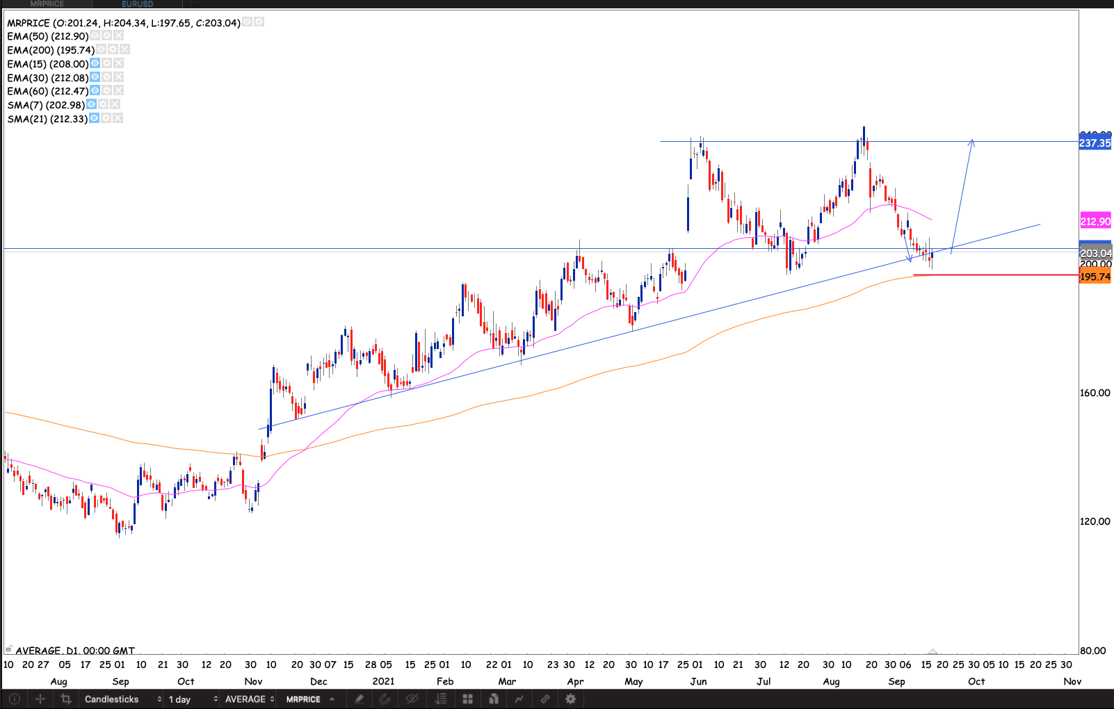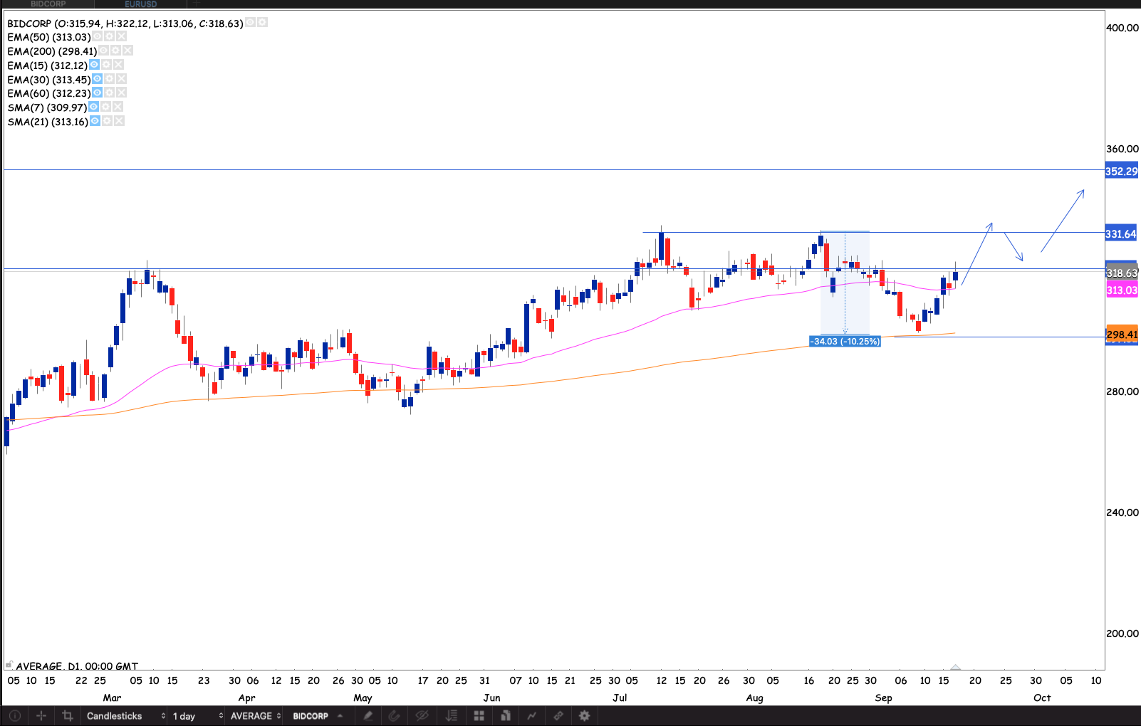 The stock fell short a couple of percent of being in a bear market (-20% decline). However the uptrend support held yet again quite close to the 200 day EMA. Providing an opportunity to start building up a position with a tight initial stop loss just below the Thursday & Friday lows, but for a bit of room just below the 200 day EMA around R195. Providing an excellent short term risk reward trade with a R240 target.