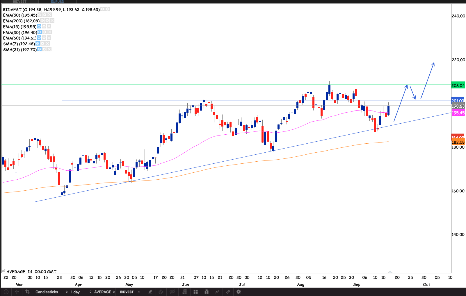 If the stock above R204 I will rebuild my position with an initial stop loss at R195.70