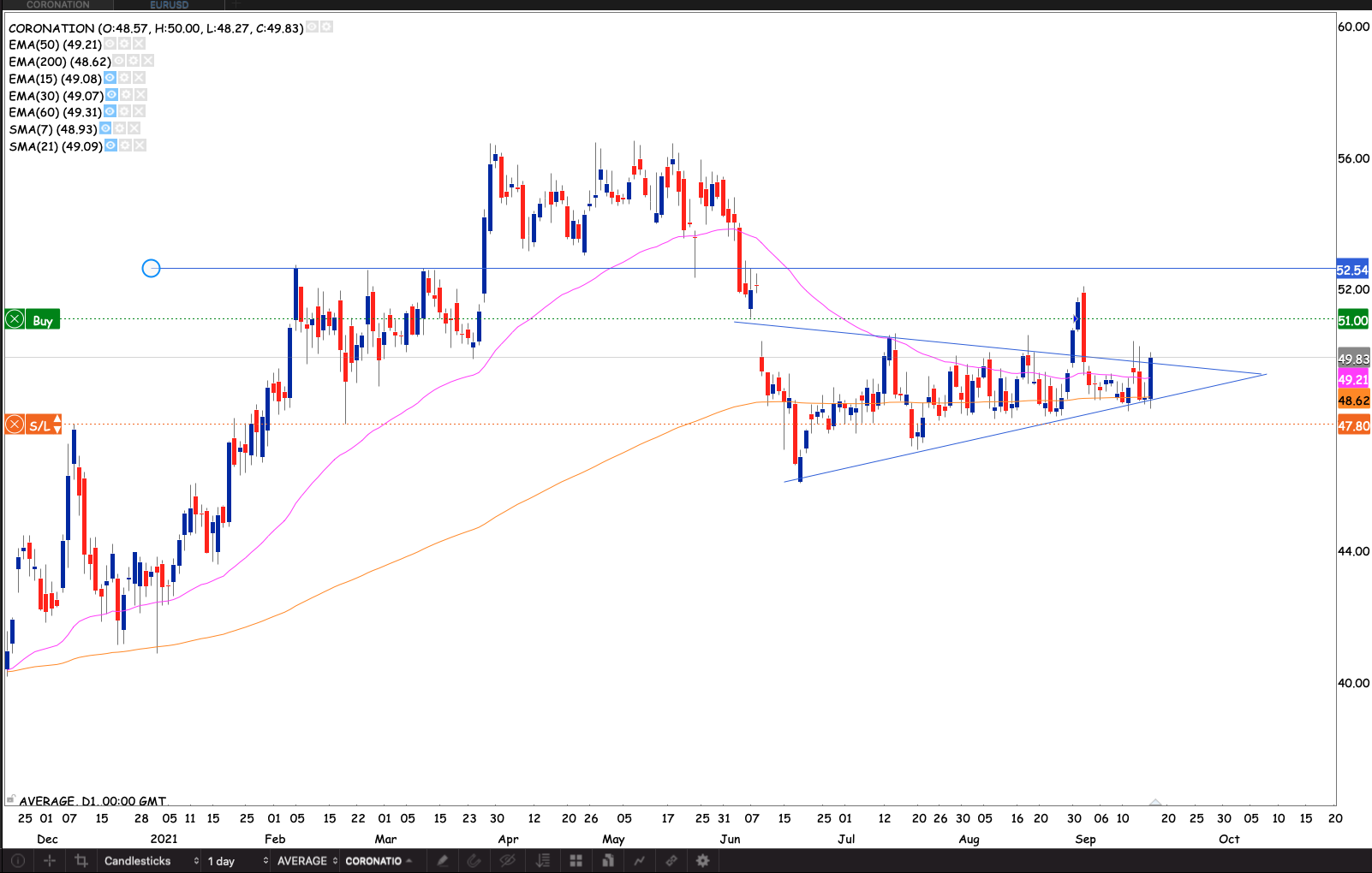 The symmetrical triangle pattern that fails 2/3rds in turns to fail as a continuation breakout. It usually signals a reversal. That happens to be bullish for the Coronation as the stock holds the 200 day EMA as support.