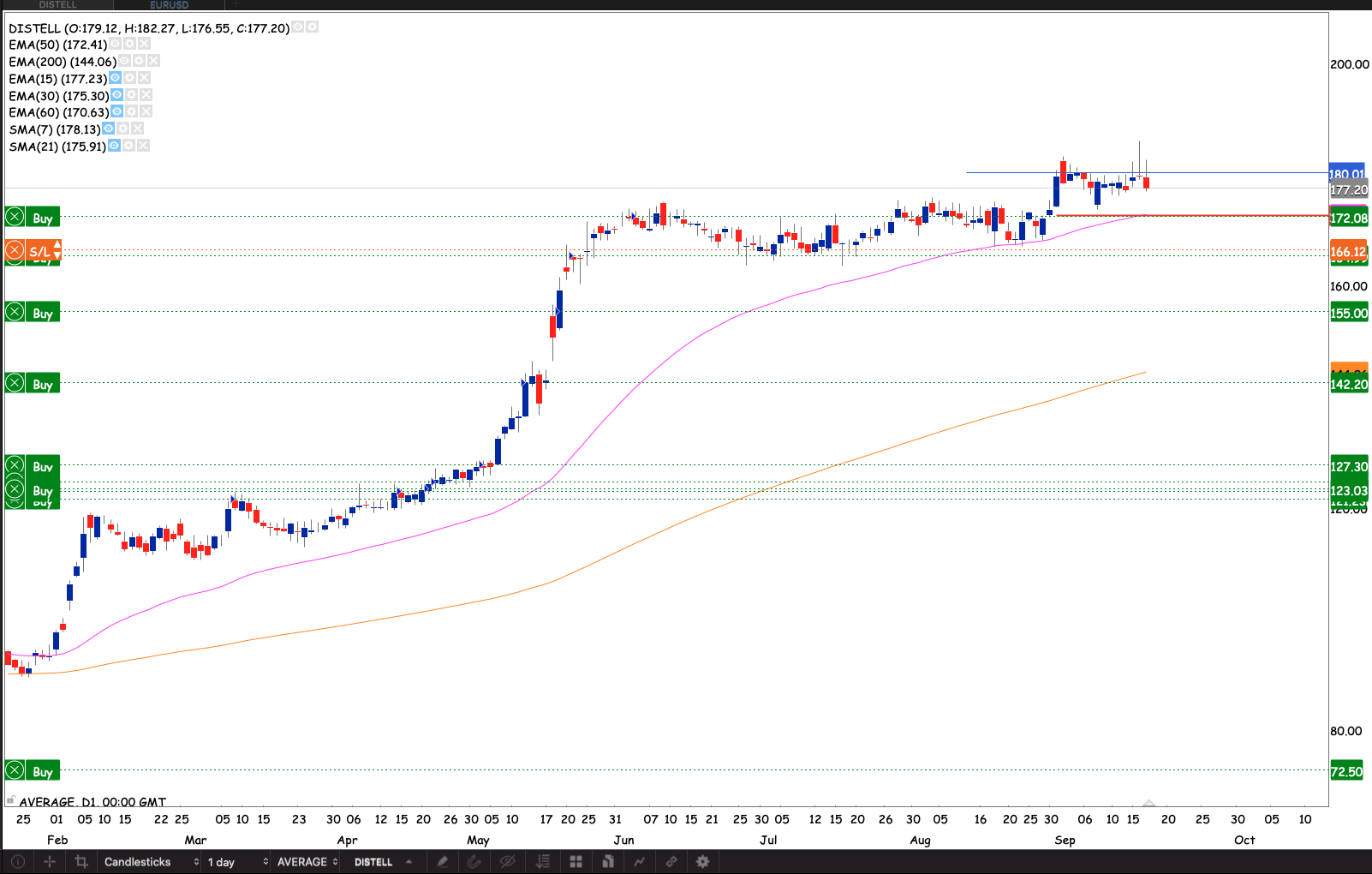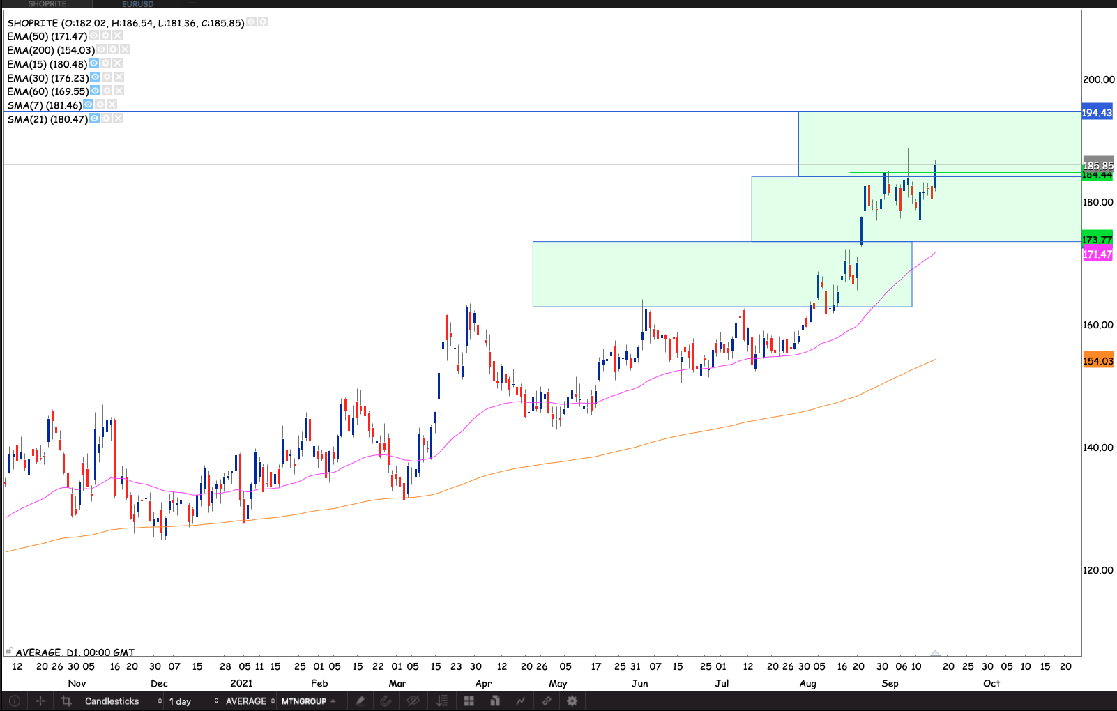We recently had a golden cross showing that indeed buyers are a bit stronger than sellers albeit not by very much. The R160 level had been like a graveyard in the sky. Until Friday at the back of a trading update. The stock closed R164.04 on Friday. I will buy the stock with my initial stop loss just below the 200 day EMA at R140.80