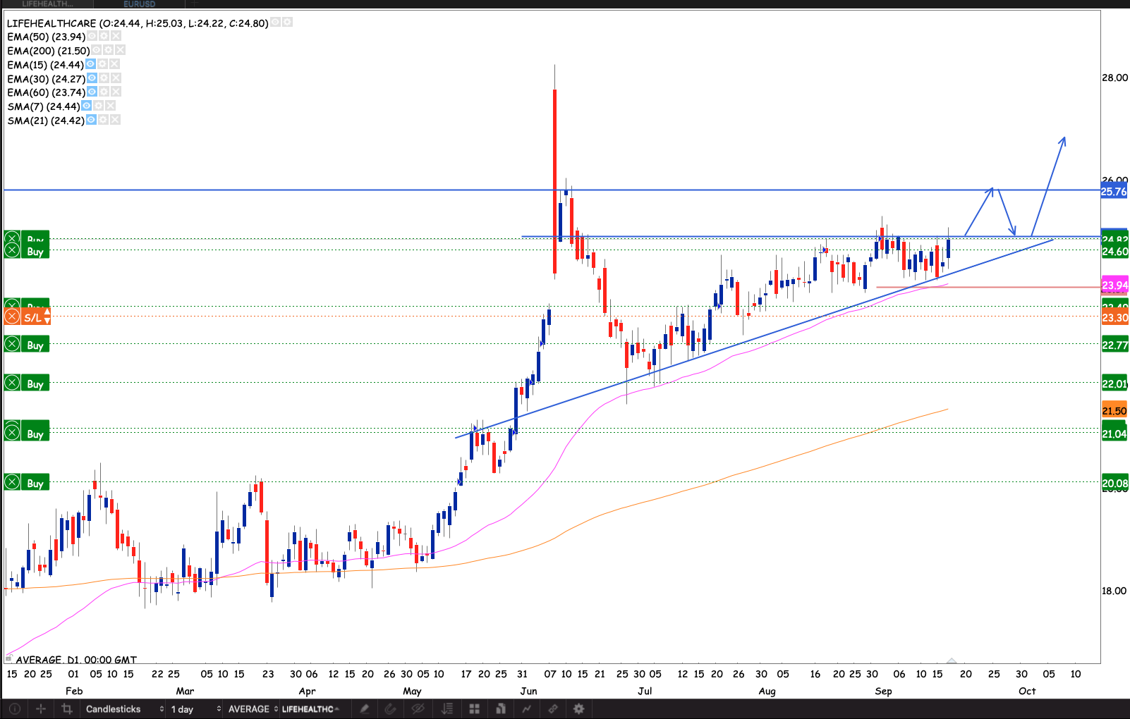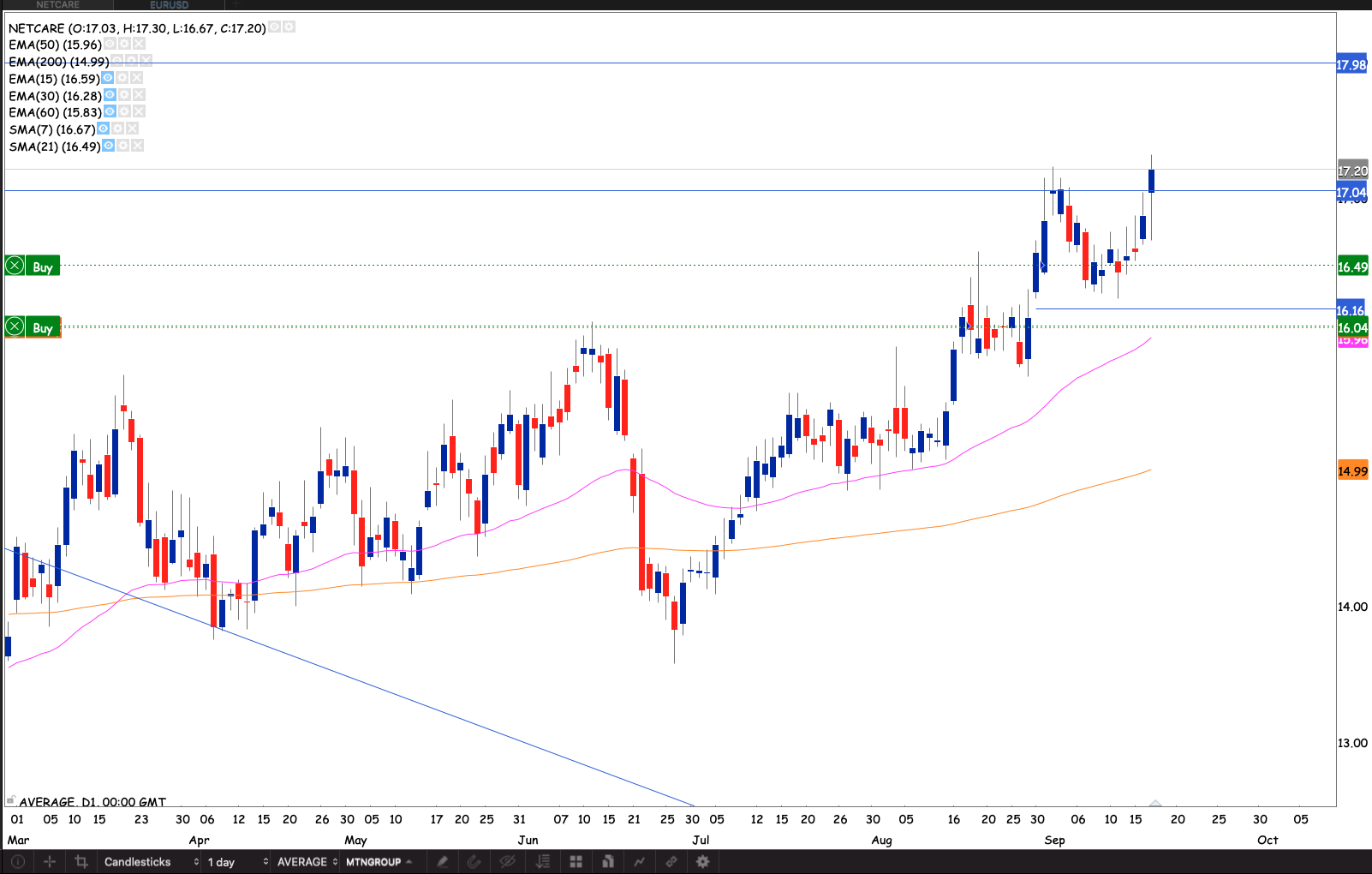 The medical stocks have been on a quietly non-volatile uptrend recently. With Covid-19 regulation starting to ease off in time. We will likely see the rise in elective surgery, as pent up demand comes back to the market, post vaccination roll-outs . A big driver of revenue for medical stocks. Life Healthcare and Netcare leading the pack. Netcare stock broke out from a short term consolidation on Friday. I will add to my position at the open on Monday. I’ve raised my stop loss to R16.04