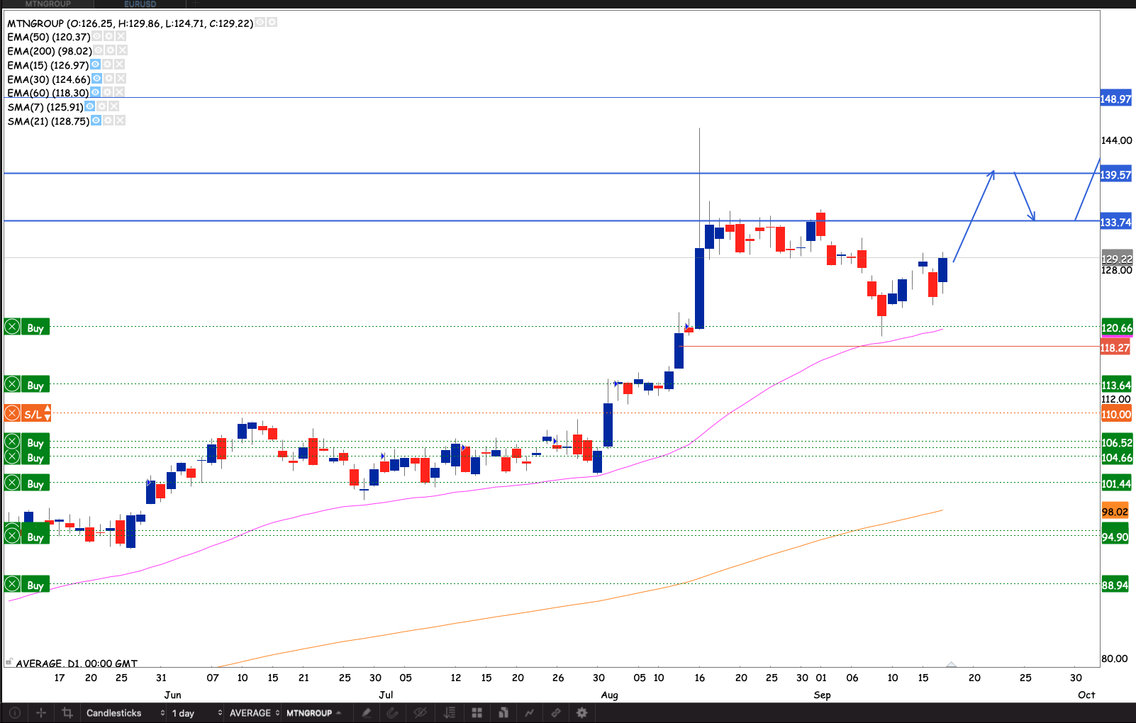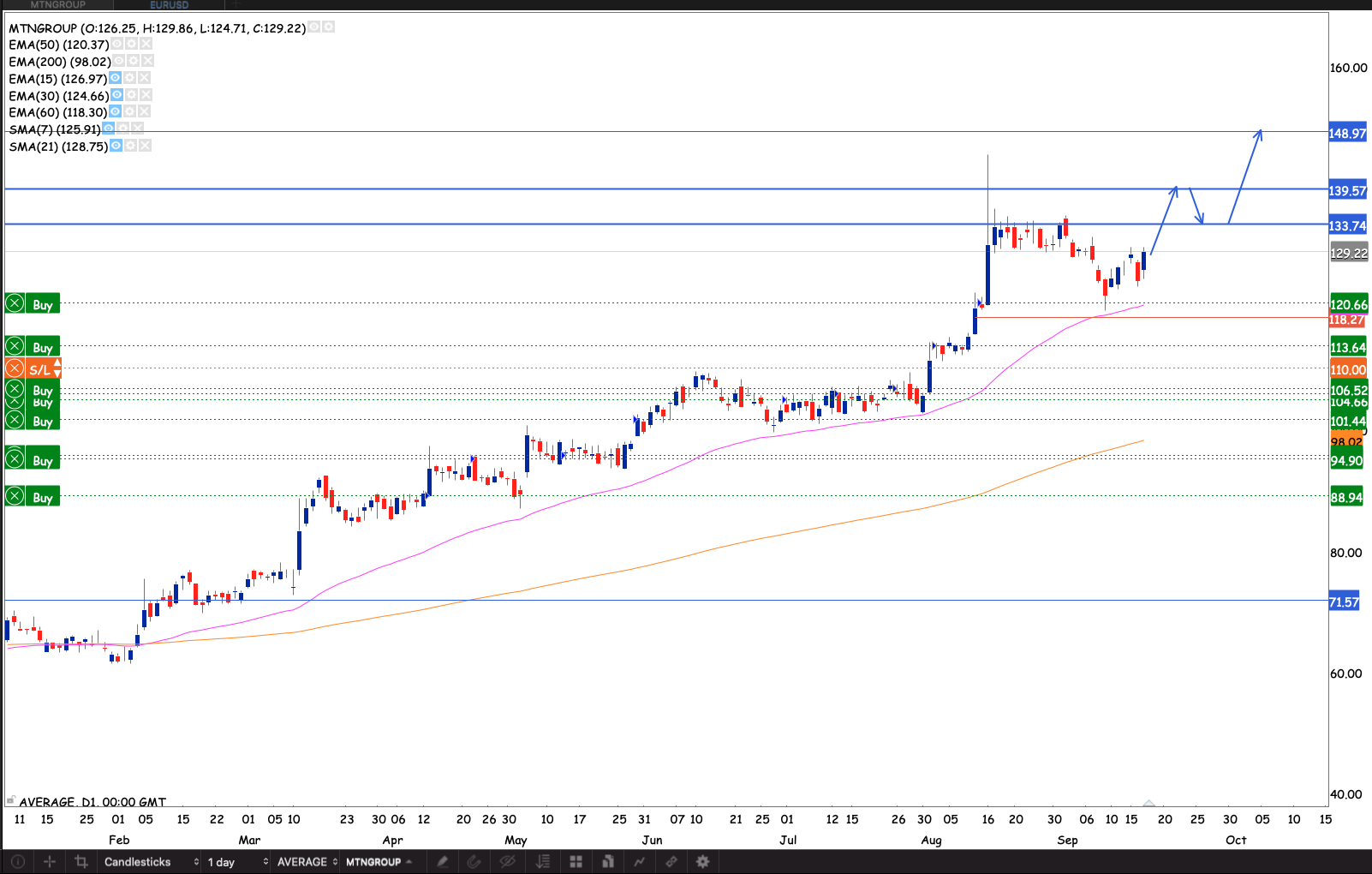 The stock had a -10% correction to the 50 day EMA repelling from it almost as if they were magnets both showing each other the same magnetic pole. If the stock breaks above R133.65 making a new 52 week high close. I will raise my stop loss to R118.20 and add to the position.